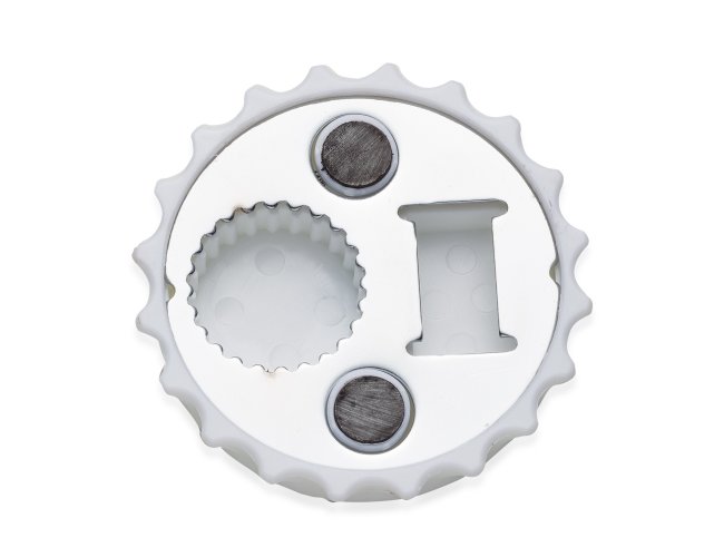 Abridor formato tampa de garrafa com imã para geladeira, contém dois tipos de abridores de garrafa.