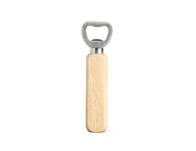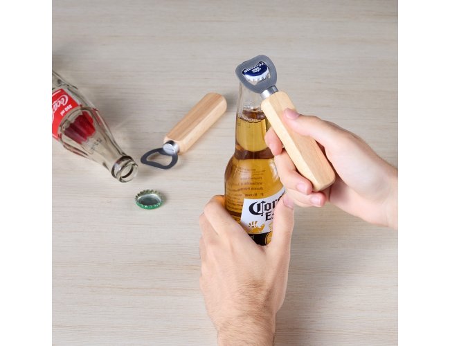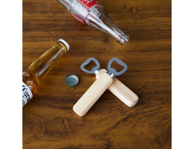Abridor metálico com cabo de madeira.