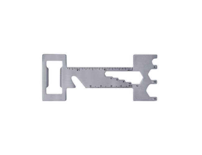 Abridor de garrafas metálico multiferramentas, possui réguas com unidades em centímetros e polegadas, 5 chaves de boca, 3 chaves hexagonais e faca de cordão.