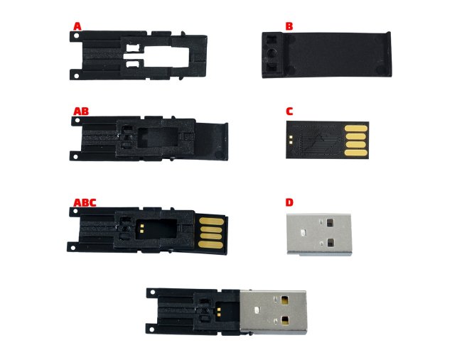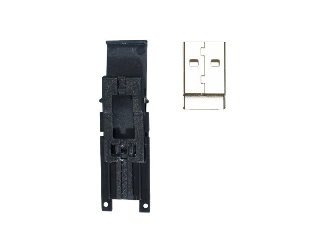 Adaptador para memória COB. Para utilização, encaixe a memória na carcaça plástica e em seguida encaixe-as na parte metálica. Após junção, não é possível desmontá-la.