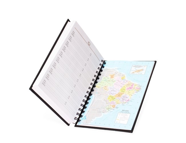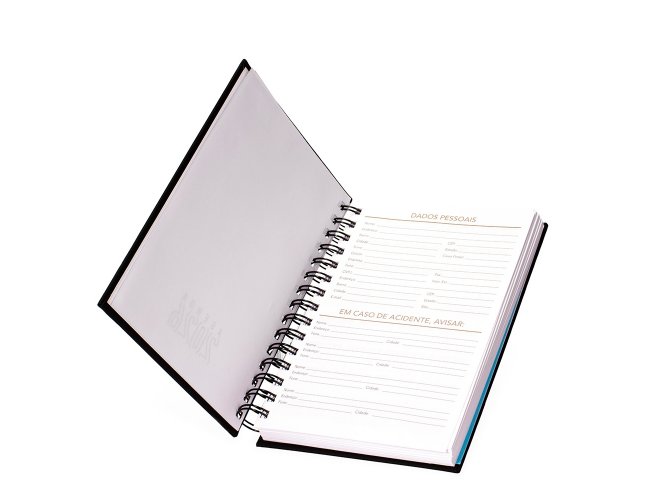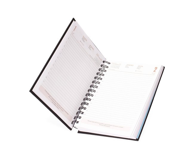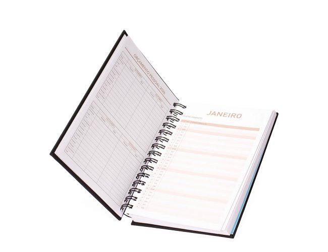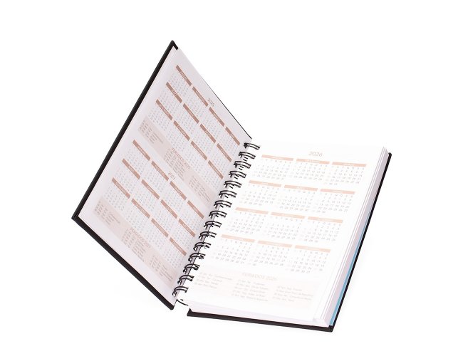 Agenda 2026 com capa emborrachada e Wire-O metálico. Contém páginas para dados pessoais, calendários de 2025 até 2027, orçamentos pessoais, anotações, planejamento mensal, endereços de contato e mapas.