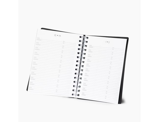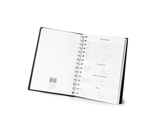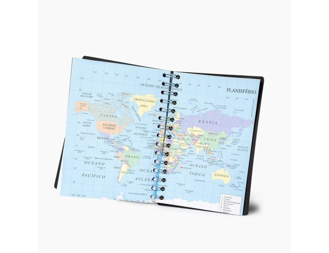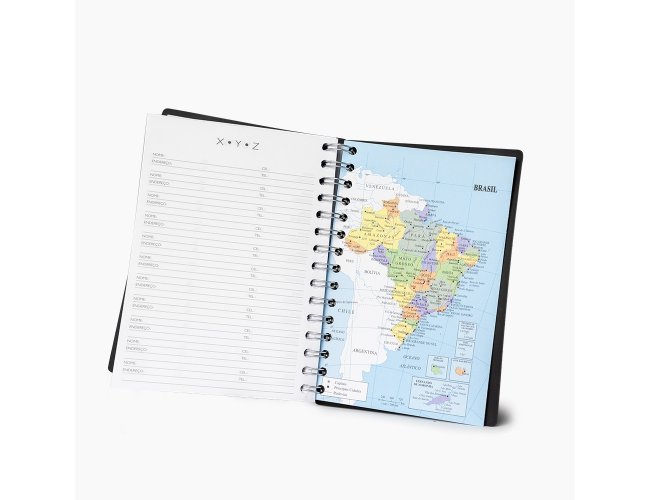 Agenda diária 2026 com espiral, material plástico para lacre. Contém folha com bolso duplo, folhas para preenchimento de dados pessoais, calendários 2025 a 2027, planejamento, receitas e despesas mensais, agenda telefônica, mapa do Brasil, mapa mundi e acompanha régua de papel 15 cm.