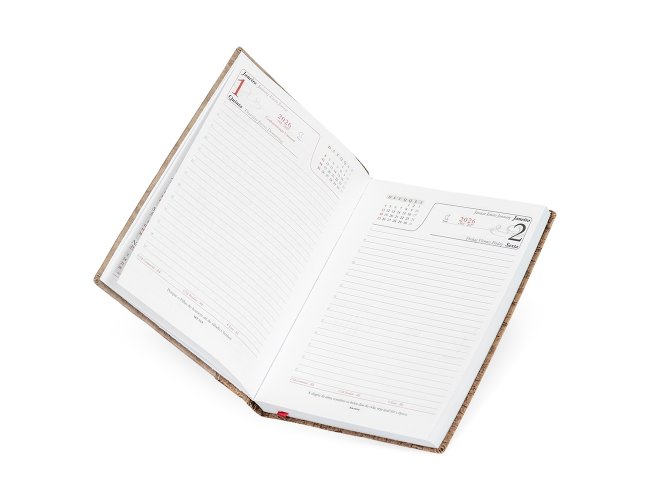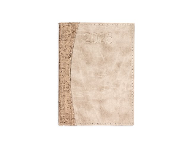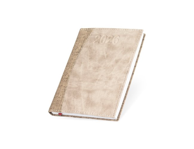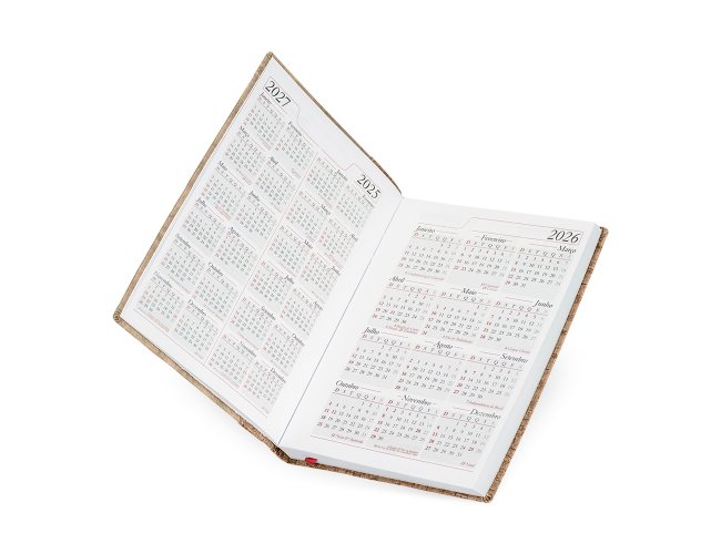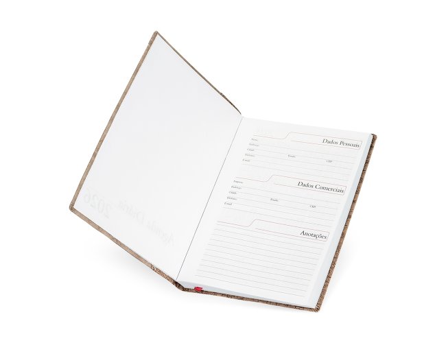 Agenda 2026 com capa em couro sintético e marcador de páginas em fita de cetim. Contém páginas dedicadas dados pessoais, calendários de 2025 até 2027, lista de contatos, planejamento diário e mapas.
