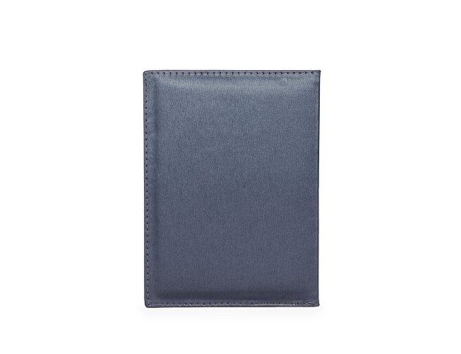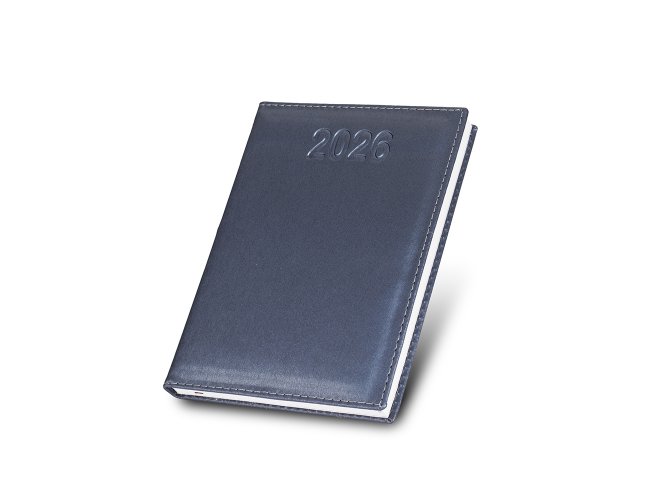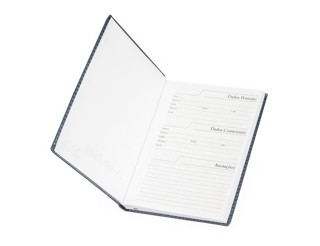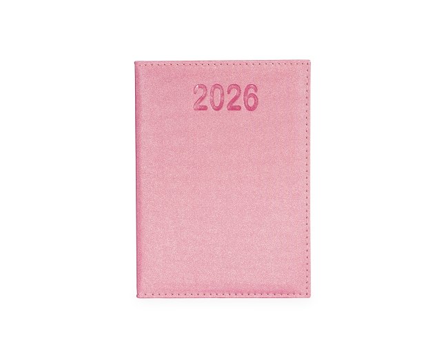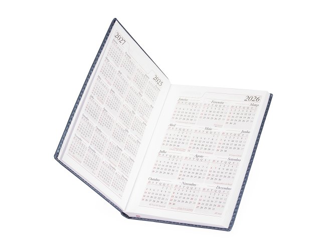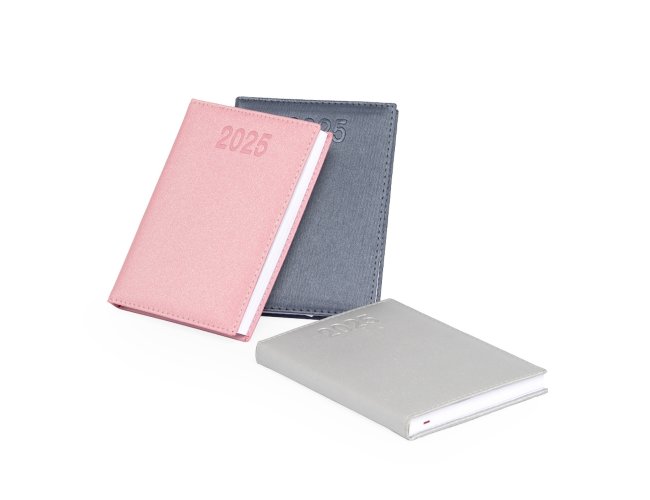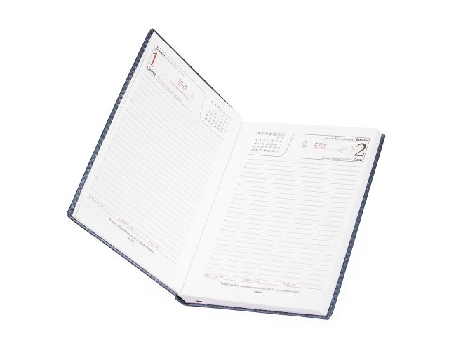 Agenda diária 2026 com capa em couro sintético metalizado e marca-páginas em fita de cetim. Possui páginas dedicadas a dados pessoais, calendários de 2025 a 2027, lista de contatos, planejamento diário e mapas.