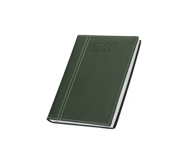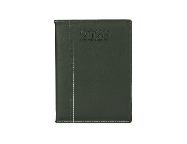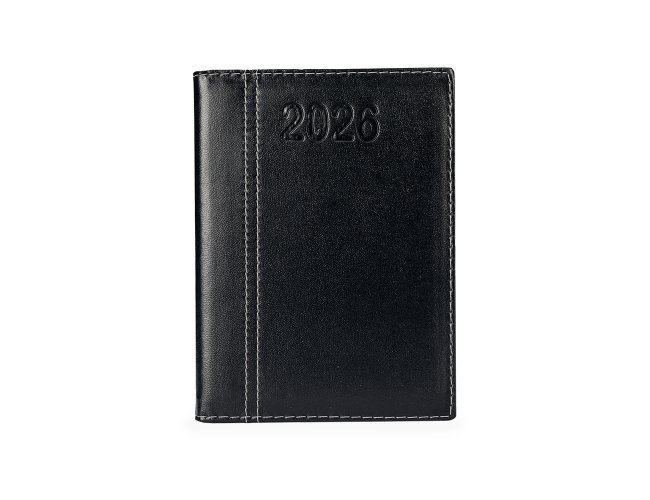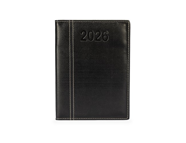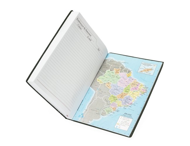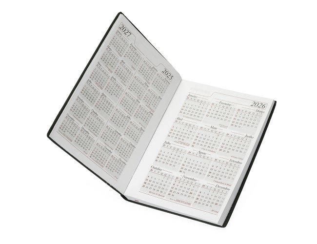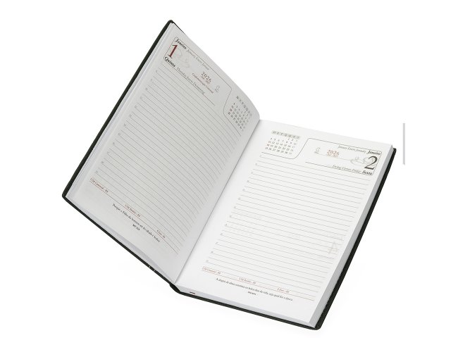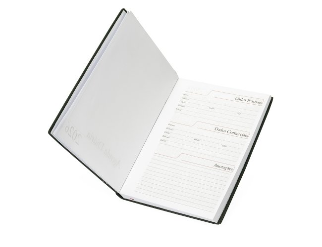 Agenda diária 2026 com capa em couro sintético e marca-páginas em fita de cetim. Possui páginas dedicadas a dados pessoais, calendários de 2025 a 2027, lista de contatos, planejamento diário e mapas.