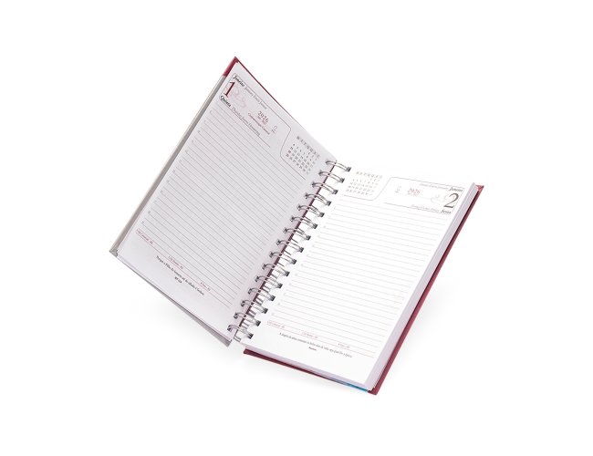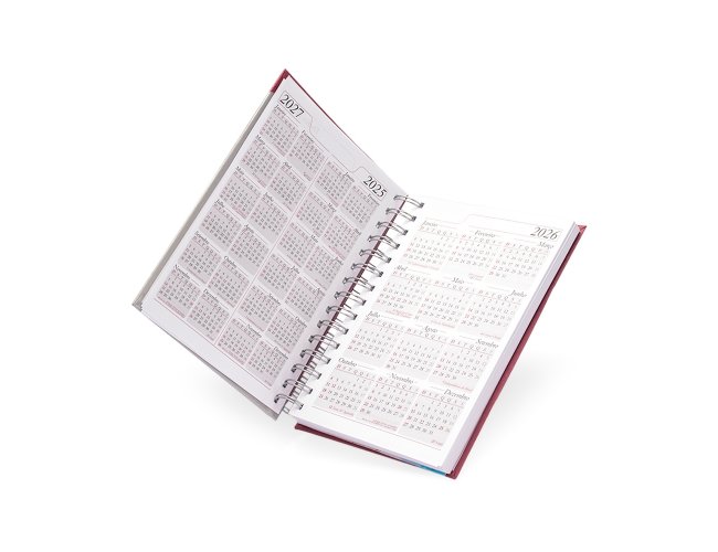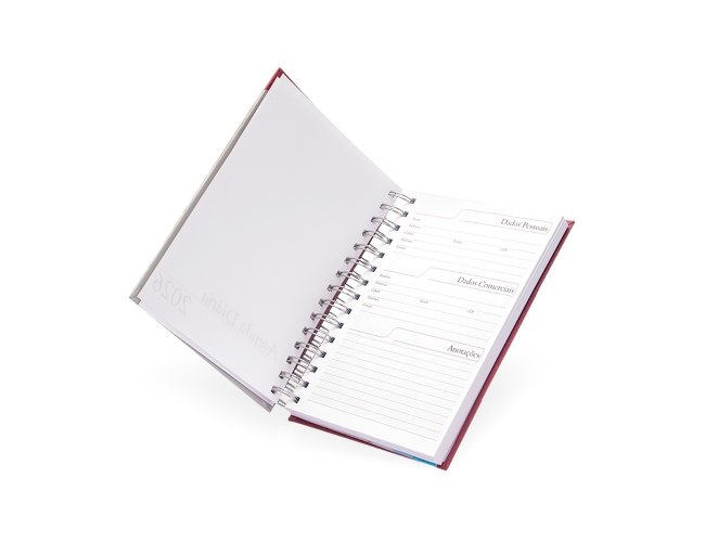 Agenda diária com capa dura em Percalux, encadernação Wire-O e bolso interno em plástico. Contém páginas dedicadas para dados pessoais, calendários de 2025 a 2027, lista de contatos, planejamento, mapas do Brasil e um mapa-múndi.