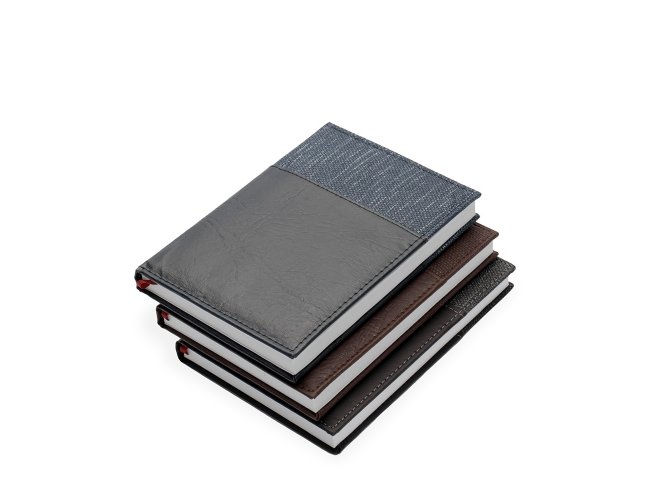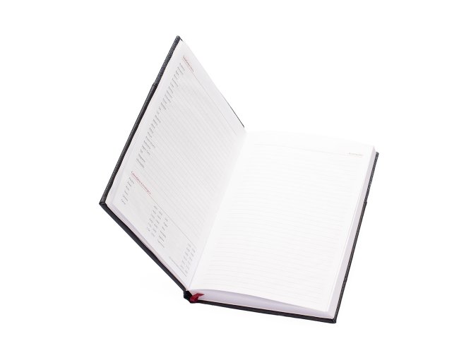 Agenda 2026 com capa dura em poliuretano (PU) e marcador de páginas em cetim. Possui páginas dedicadas a dados pessoais, calendários de 2026 a 2028, lista de contatos e itens de conversão de unidades de medidas, códigos DDD e DDI e mapas.