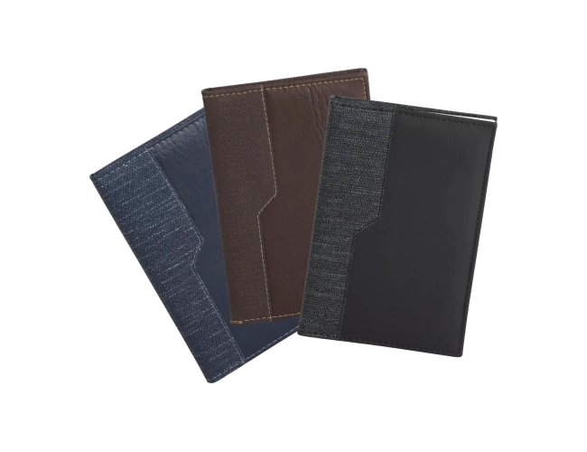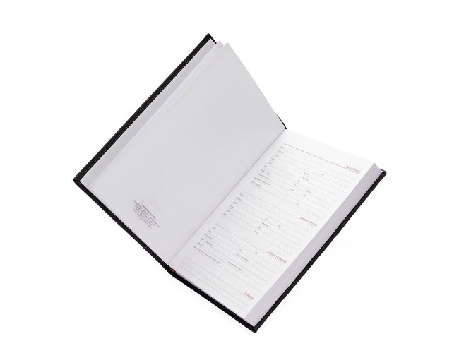Agenda diária 2026 com capa em couro sintético e marca-páginas em fita de cetim. Apresenta páginas dedicadas a dados pessoais, calendários de 2025 até 2027, listas de telefones úteis, planejamento diário e financeiro, lista de contatos e mapas.