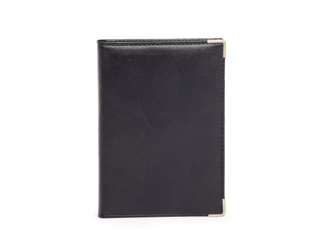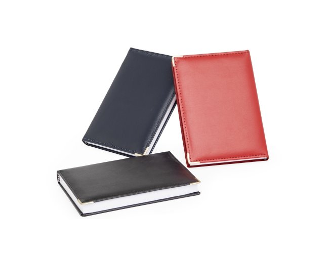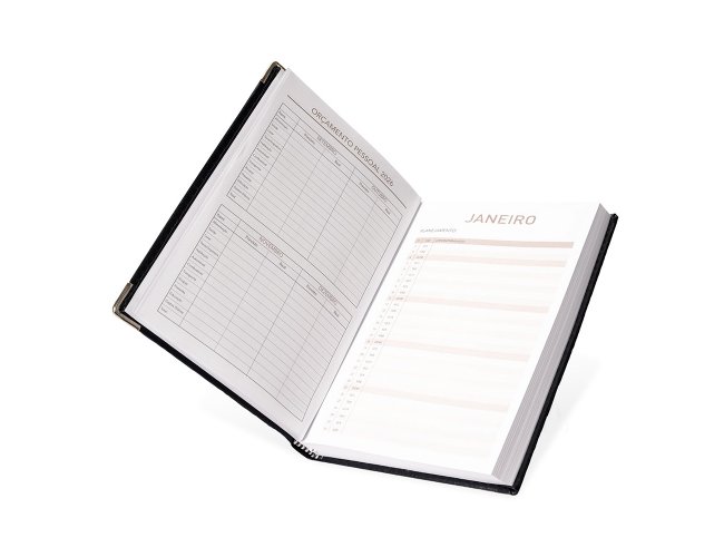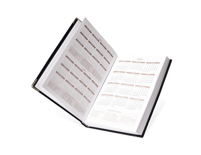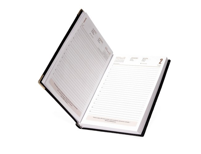 Agenda diária 2026 com capa em couro sintético e marca-página em fita de cetim. Possui páginas dedicadas para dados pessoais, calendários de 2025 até 2027, orçamento pessoal, planejamento mensal, lista de contatos e mapas.