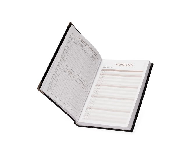 Agenda diária com capa feita em couro sintético e marca-página em fita de cetim. Contém páginas dedicadas a dados pessoais, calendários de 2025 até 2027, orçamento pessoal, anotações, planejamentos mensais, lista de contatos e mapas.