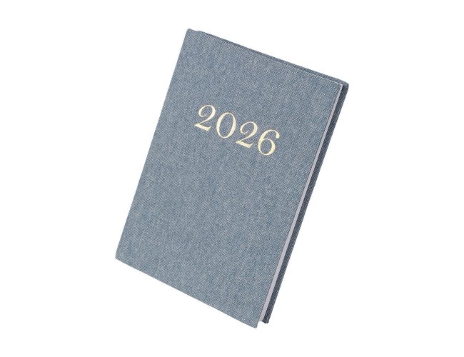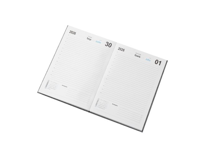 Agenda diária 2026 com capa dura com revestimento em linho. Contém páginas dedicadas a dados pessoais, calendários 2026 a 2028, planejamento diário de 2026 e lista de códigos DDI.