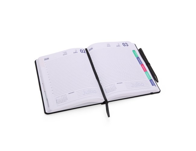 Agenda diária 2026 com capa em linho com detalhe em metal, marca-páginas feito em cetim, porta-canetas lateral e fechamento em elástico. Possui páginas para planejamento mensal, calendários de 2026 a 2028, além de listas de conversão de pesos e medidas, contatos e códigos DDI.