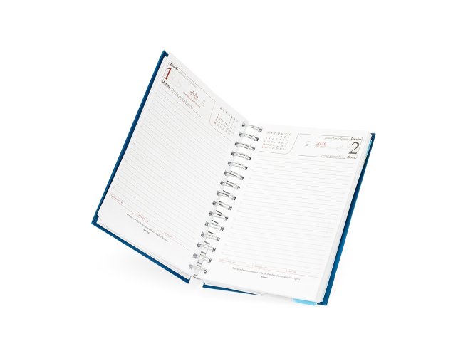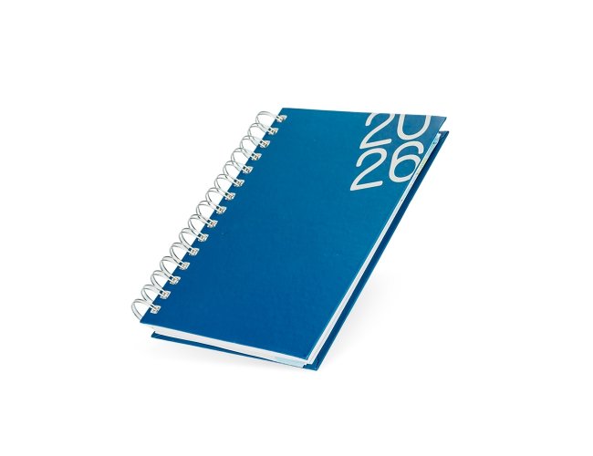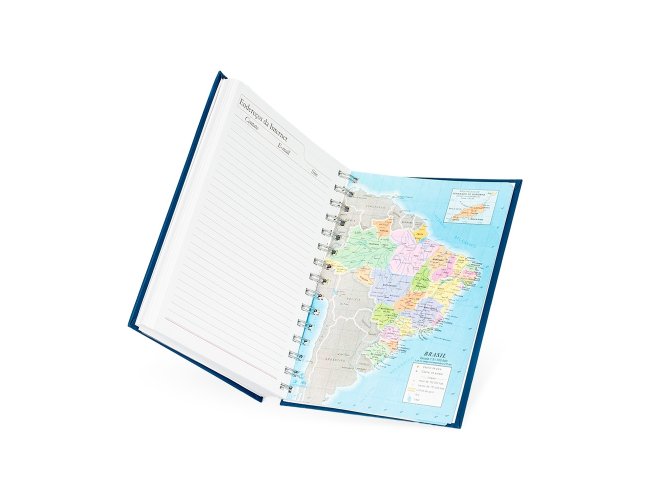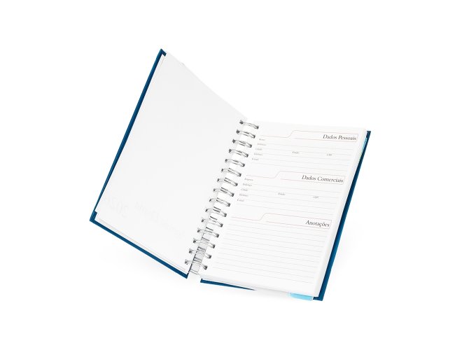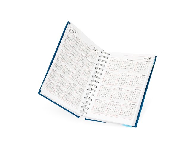 Agenda 2026 com capa dura em Percalux, bolso plástico interno e encadernação Wire-O. Contém páginas dedicadas dados pessoais, calendários de 2025 até 2027, lista de contatos, planejamento diário e mapas.