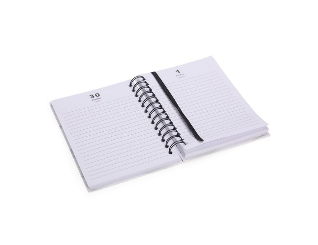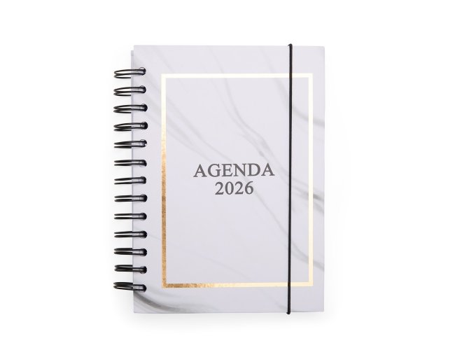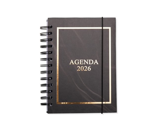 Agenda diária em capa dura, encadernação Wire-O, elástico de fechamento e marca-páginas em cetim. Contém ainda páginas dedicadas a dados pessoais, calendários de 2026 a 2028, planejamento mensal e lista de contatos.