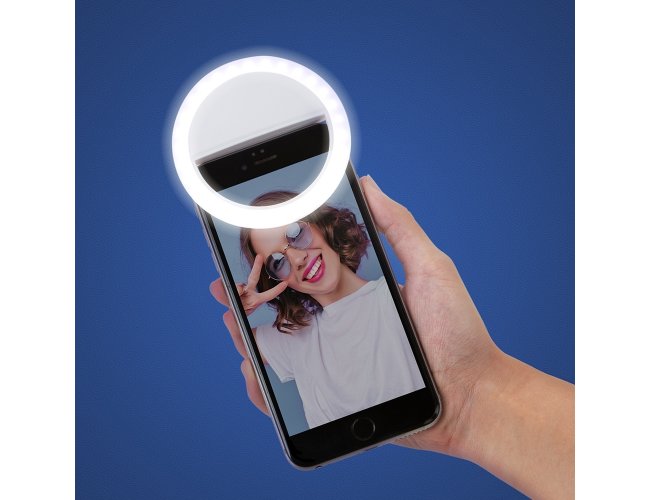 Melhore a qualidade das selfies e registre momentos únicos com mais luz e brilho! Nosso Anel de iluminação para celular, é um ?Ring light? plástico, mais compacto, e no formato ?presilha? para encaixe. Ainda possui três estágios de iluminação acionados pelo botão superior. Acompanha cabo USB para carregamento.