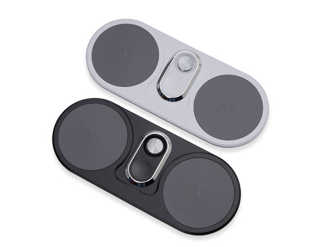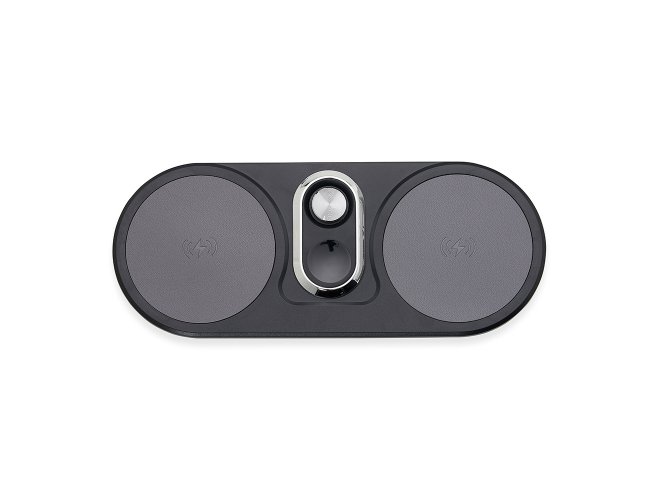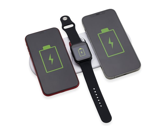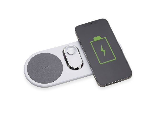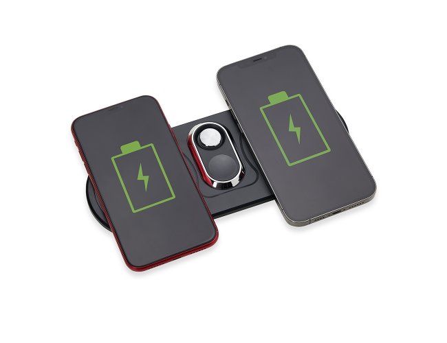 Base de carregamento por indução dual para celulares e Iwatch. Com ?almofadas? de indução para o carregamento de celulares simultaneamente, a base contém na área central uma área indutiva para o carregamento de Iwatch com luzes leds indicativas de funcionamento. Para maior estabilidade em superfícies, a base possui borrachas antideslizantes na área inferior. Acompanha cabo USB Tipo-C.
