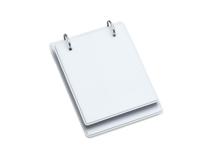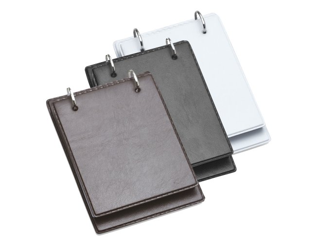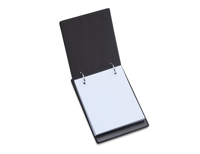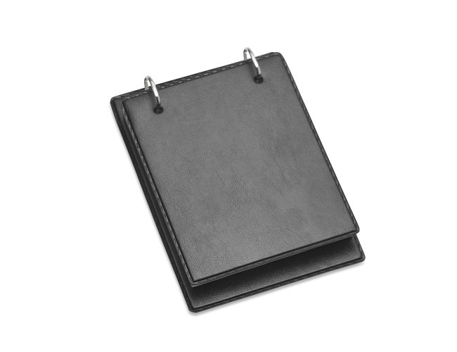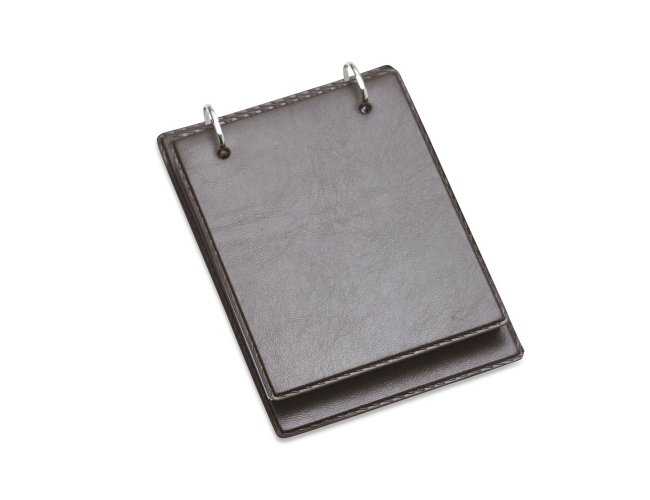 Bloco de anotação de mesa com trilho de ferro, material couro sintético. Possui aproximadamente 150 folhas sem pauta. OBS.: PEDIDOS APENAS MÚLTIPLOS DE 10 PEÇAS!