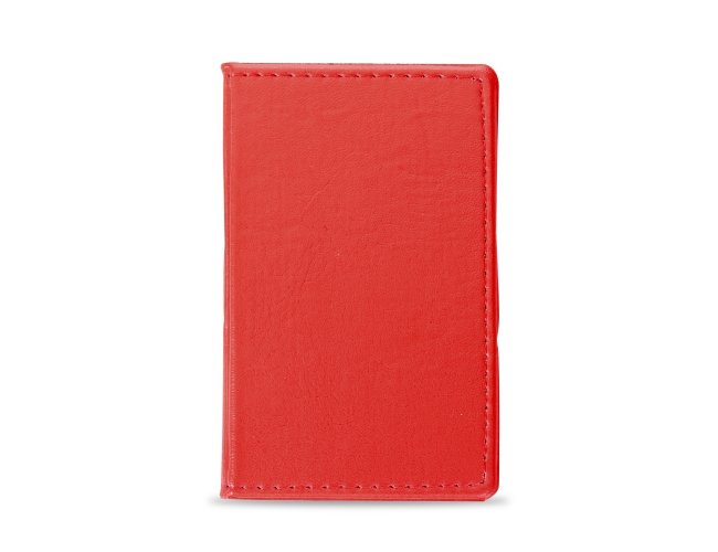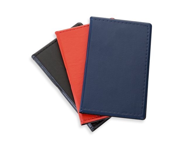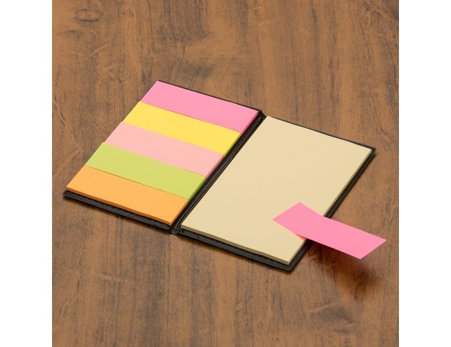 Bloco de anotações em couro sintético com autoadesivos, frente e verso liso. Possui cinco blocos coloridos autoadesivos com aproximadamente 25 folhas e bloco amarelo com aproximadamente 30 folhas.