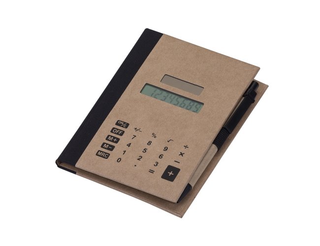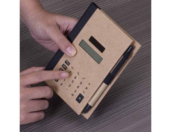 Bloco de anotações ecológico com capa calculadora solar de 8 dígitos acoplada. Possui quatro blocos autoadesivos com aproximadamente 25 folhas cada, bloco verde com aproximadamente 25 folhas, bloco branco de rascunho com aproximadamente 30 folhas sem pauta e suporte elástico com caneta ecológica de papelão com clip e ponteira plástica preto.