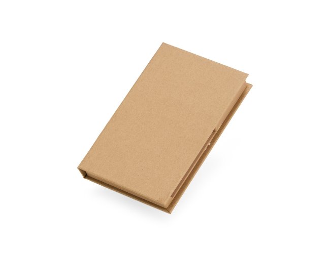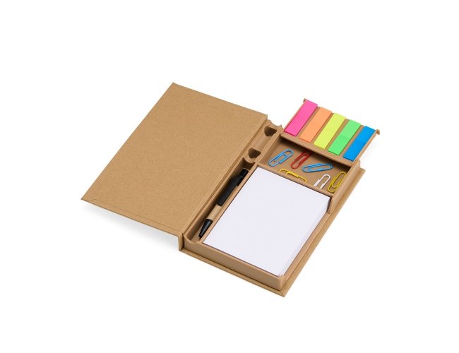 Tudo em seu lugar, prontinho para as anotações! Nosso Bloco de Anotações Ecológico é perfeito para manter a organização enquanto se registra ideias. Feito de material kraft, ele vem com 100 folhas brancas para anotações, 5 marcadores autoadesivos coloridos para destacar o que é importante, 7 clips guardados em uma gavetinha prática e uma mini caneta de papelão com carga esferográfica azul. E ainda conta com espaço para armazenar a caneta e dois suportes porta-caneta, garantindo praticidade no dia a dia. Este bloco é tudo o que o seu cliente precisa para dias repletos de anotações.
