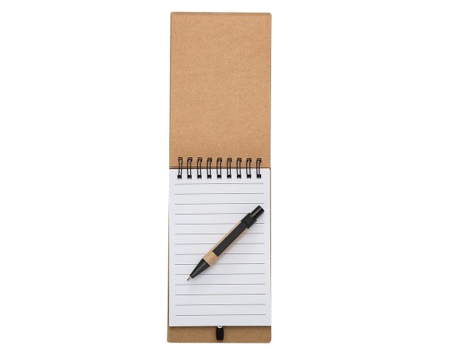Bloco de anotações ecológico com autoadesivos e mini caneta. Bloco com wire-o e detalhes vazados na capa, contém conjunto de cinco bloquinhos autoadesivos coloridos, bloco autoadesivo pequeno, miolo com folhas pautadas e suporte de nylon com mini caneta de papelão com carga esferográfica na cor azul e acionamento por clique..