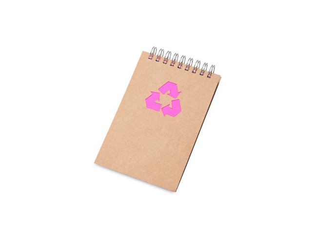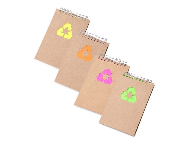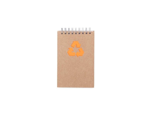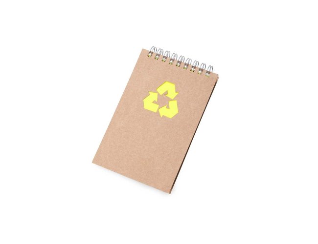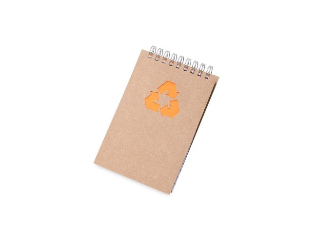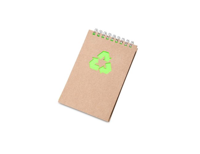 Bloco de anotações ecológico com wire-o. Contém aproximadamente 80 páginas pautadas na cor branca.
