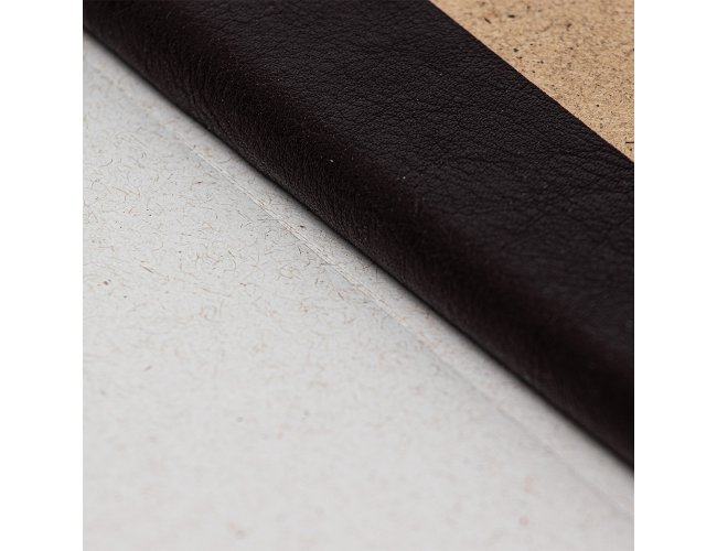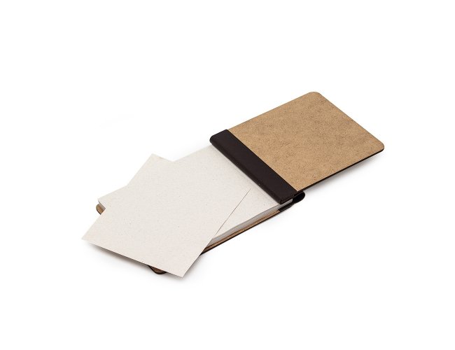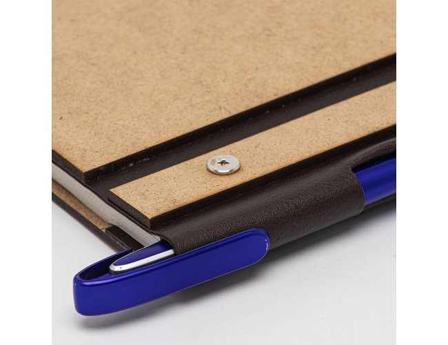 Bloco de anotações Ecológico em MDF com porta caneta e detalhes em couro sintético. Contém aproximadamente 98 folhas recicláveis e sem pauta.