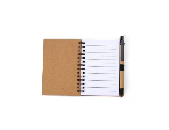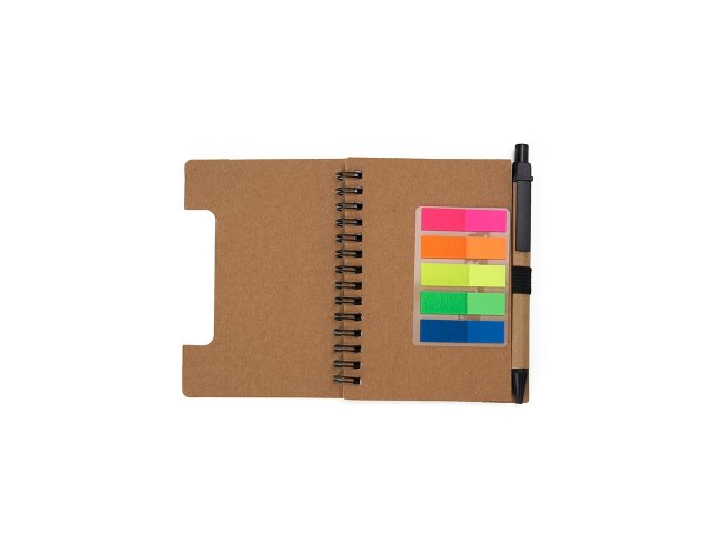 Bloco de anotações ecológico com autoadesivos e caneta de papelão, contém cinco blocos autoadesivos com aproximadamente 25 folhas e bloco com aproximadamente 70 folhas pautadas. Possui suporte de nylon para caneta e acompanha caneta de papelão com detalhes em plástico, carga esferográfica na cor azul e acionamento por clique.