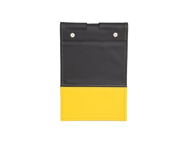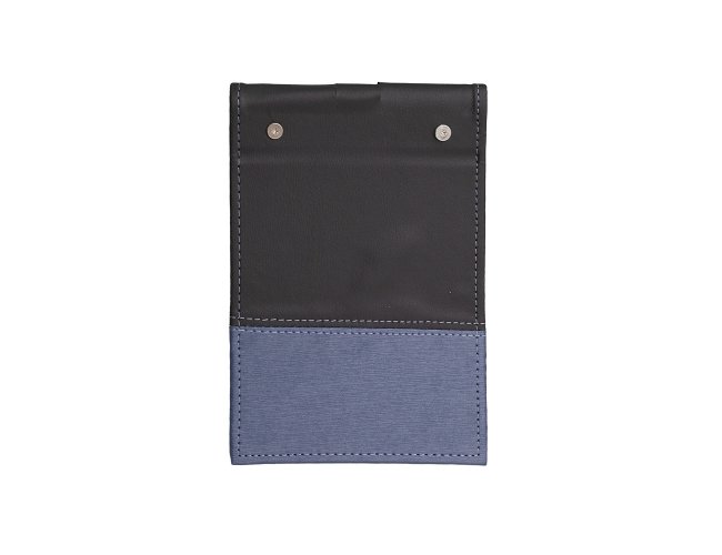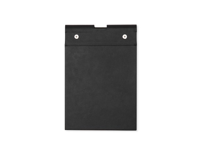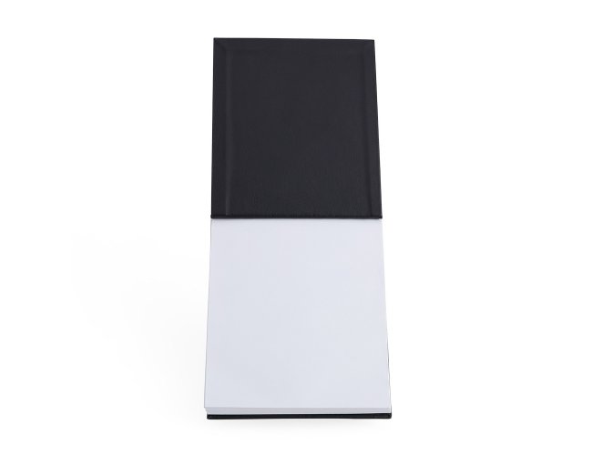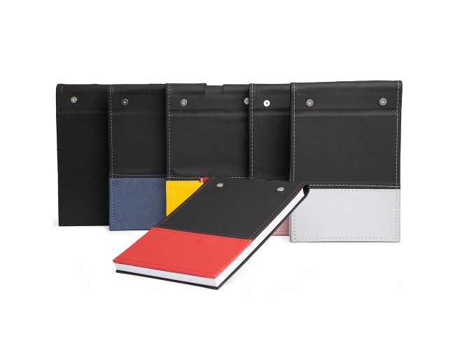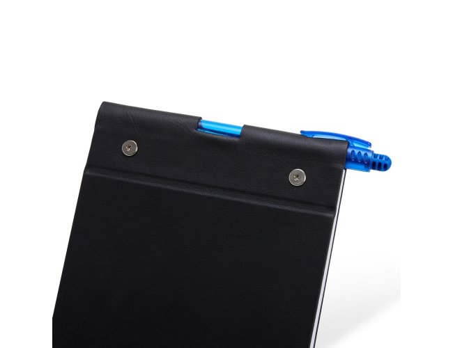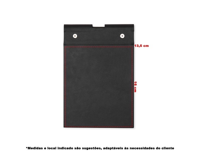 Bloco de anotações em couro sintético com porta caneta. Possui aproximadamente 100 folha brancas sem pauta.