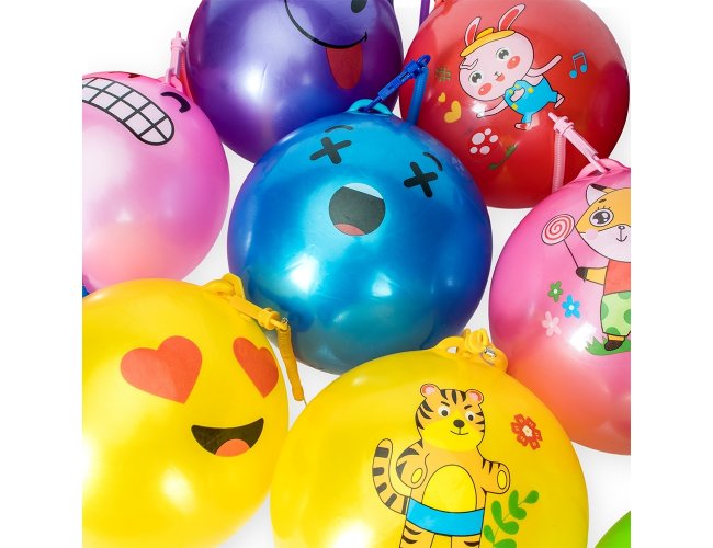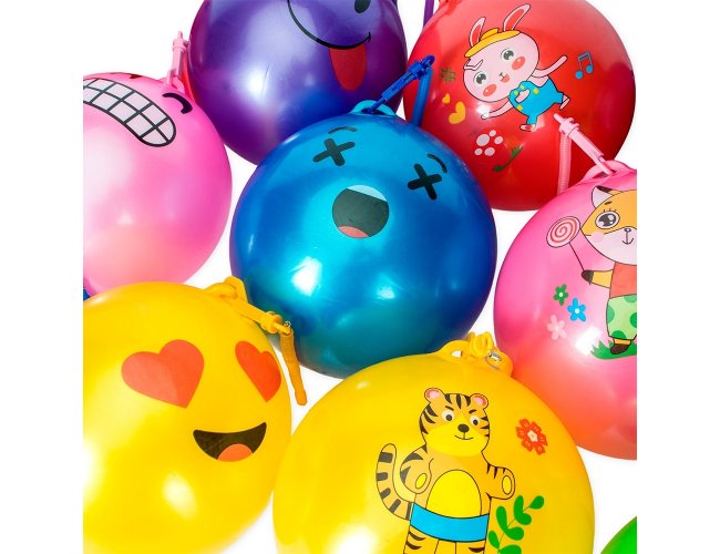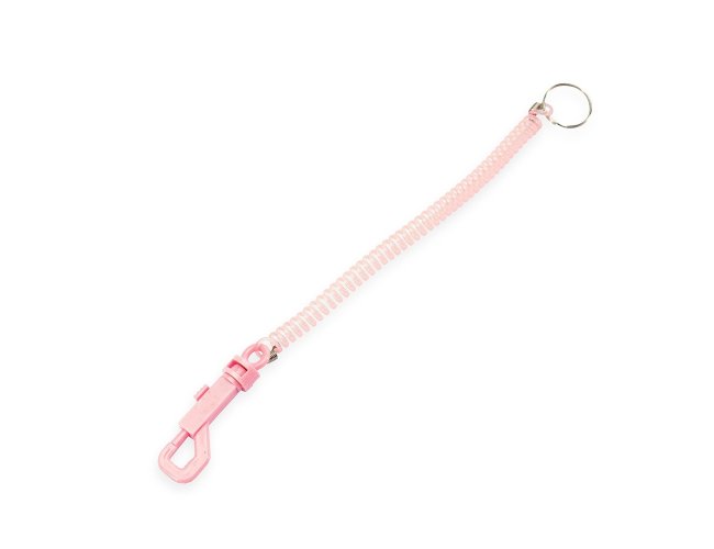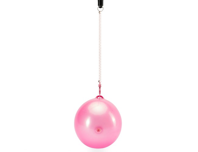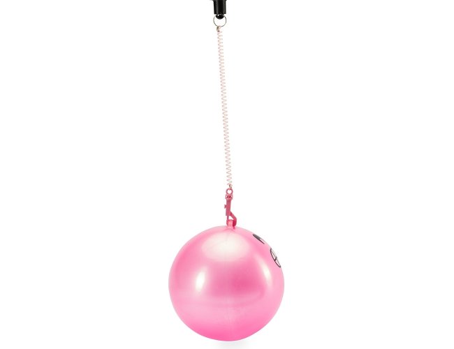 Bola inflável em vinil acompanhada de cordão em mola plástica flexível com mosquetão em uma extremidade e argola metálica na outra.