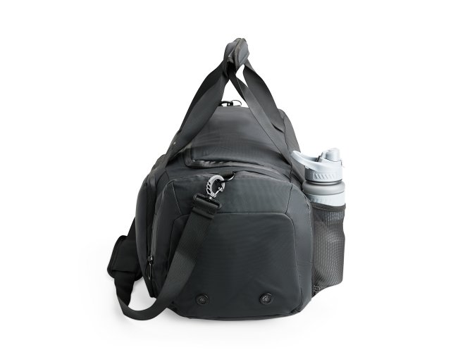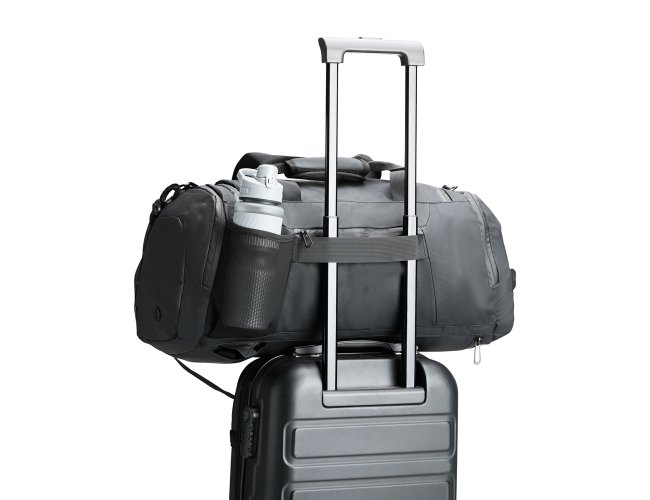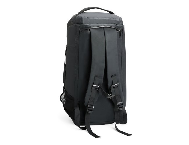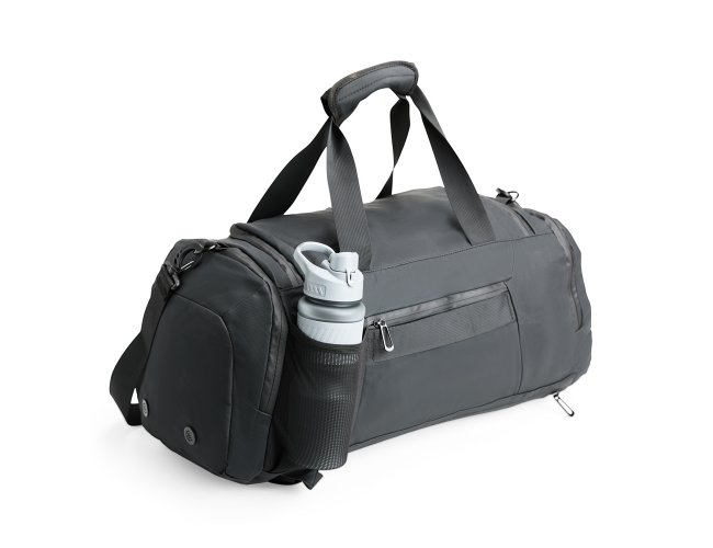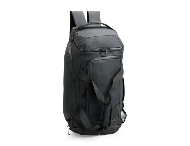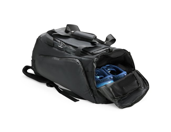 Bolsa confeccionada em filme sintético tipo couro impermeável com capacidade de até 35 litros. Possui compartimento interno amplo dois bolsos em tela e fechamento em zíper, além de quatro bolsos externos de tamanhos variados e fechamento em zíper e um em tela com elástico. Apresenta alças de mão com suporte de juntura e um par de alças ocultas na parte inferior da bolsa, que permitem seu uso como mochila. Contém alça transversal removível.
