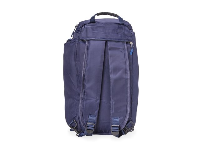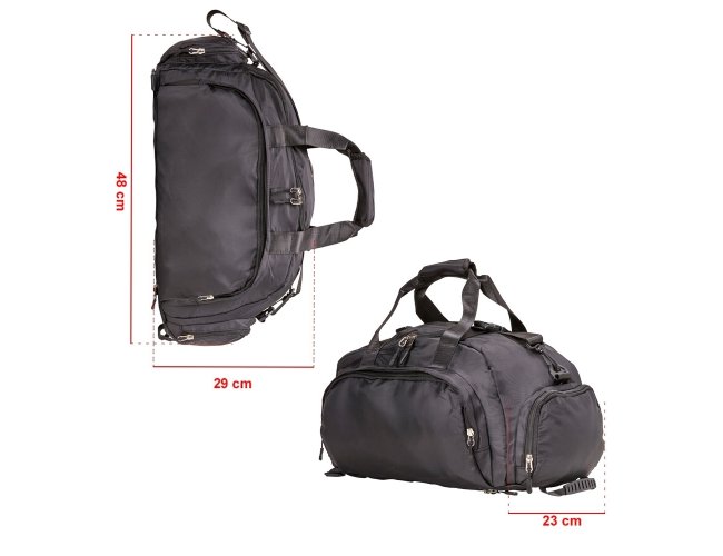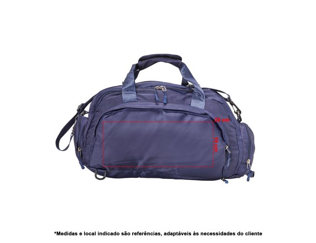 Bolsa esportiva de 33 litros em poliéster de impacto impermeável com cinco compartimentos, sendo três deles exclusivos para tênis, itens molhados e armazenamento das alças de costas. Com alça transversal removível e alça de mãos com suporte de juntura, a bolsa contém alças de compensação e alças para as costas ocultas no compartimento inferior, podendo ser transportada como mochila.