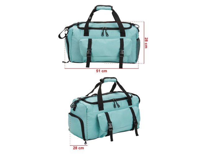 Bolsa esportiva de 39 litros em nylon resistente à água com três compartimentos, sendo um deles exclusivos para tênis. Compartimento principal com bolso de zíper exclusivo para itens molhados. Com bolso lateral telado e alças de mãos com suporte de juntura, a bolsa contém alça transversal removível e alça para engate em malas de viagem.