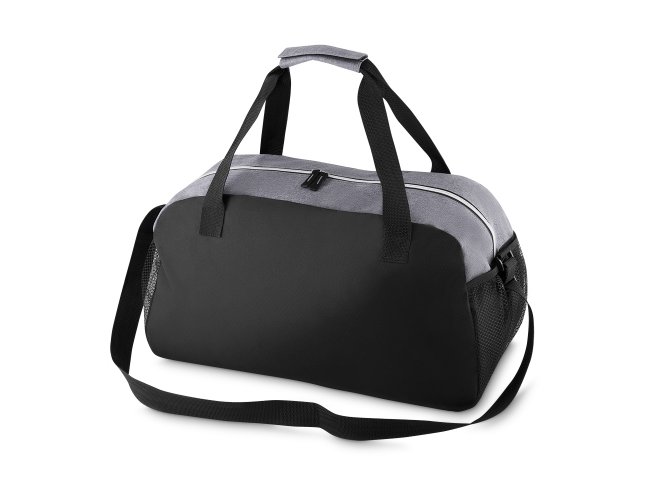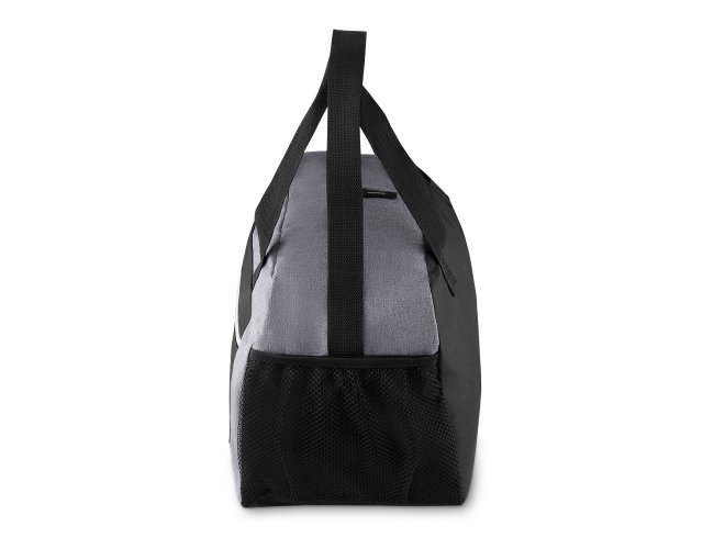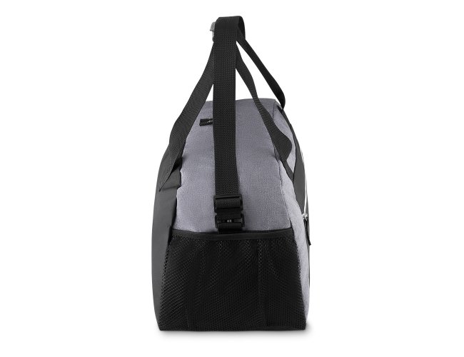 Bolsa esportiva de poliéster. Possui alça de mão com pegador cinza de velcro, alça ajustável para as costas e bolsos laterais de malha.