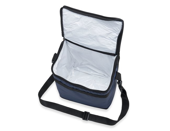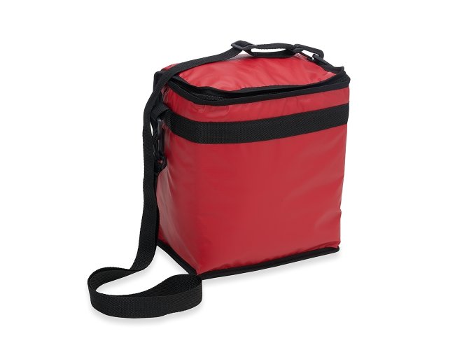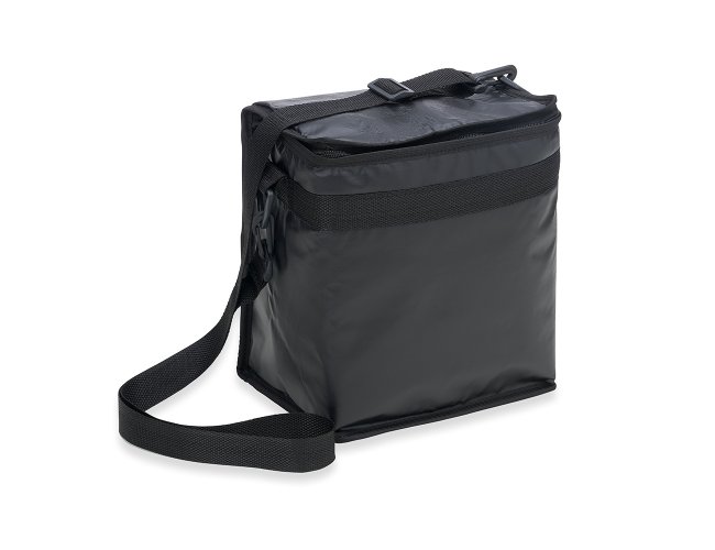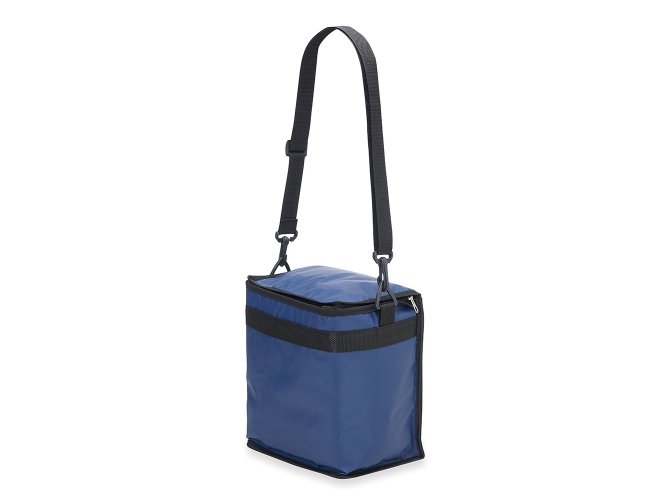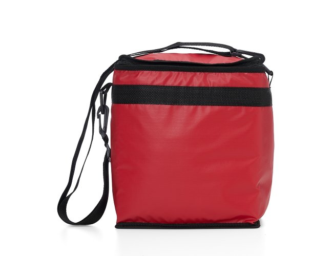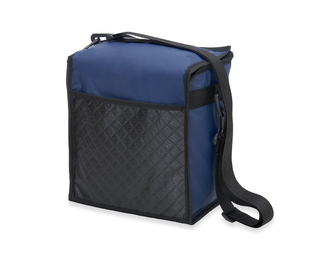 Bolsa térmica de bagum sintético com capacidade de 10 litros, contém revestimento interno em polietileno atóxico soldado (não vaza), bolso sintético externo de matelassê e alça tiracolo ajustável de polipropileno.