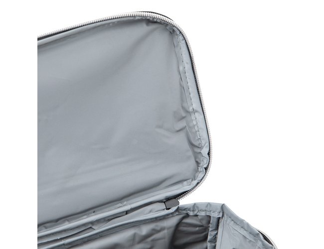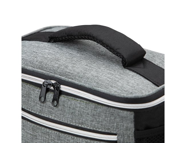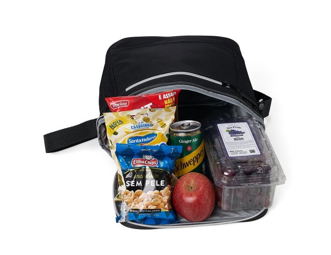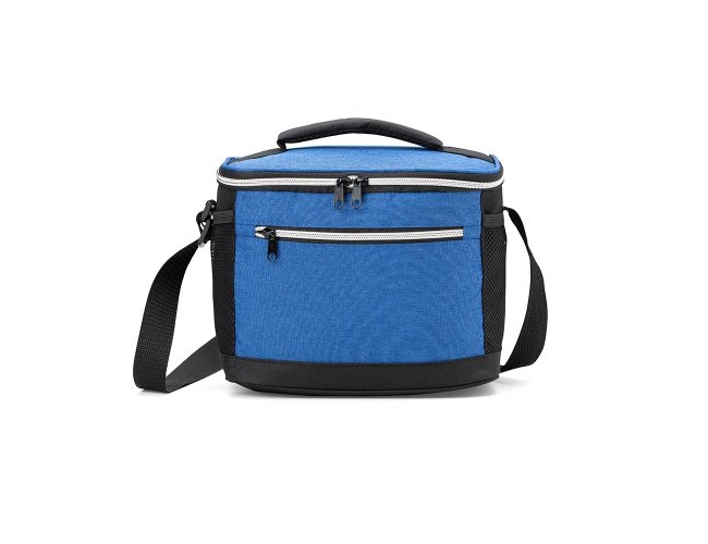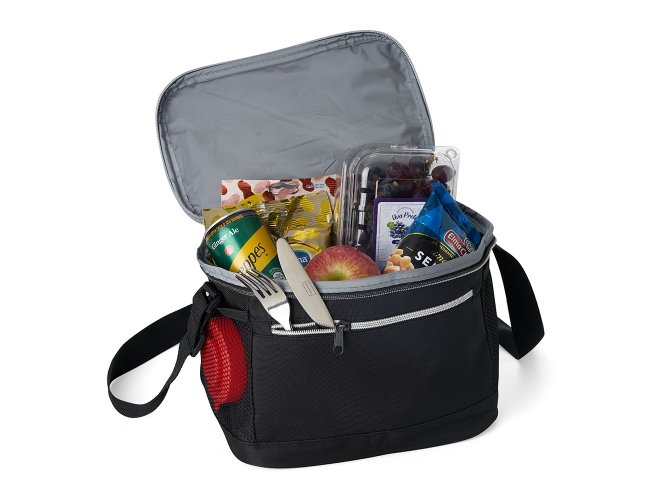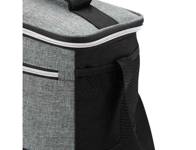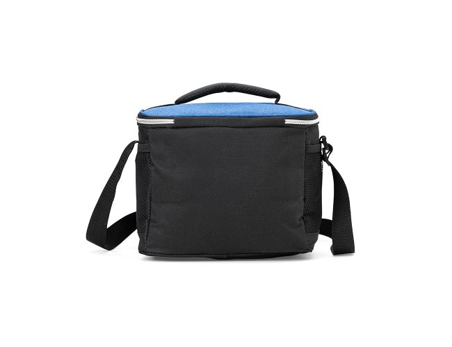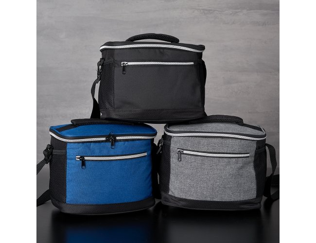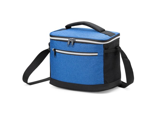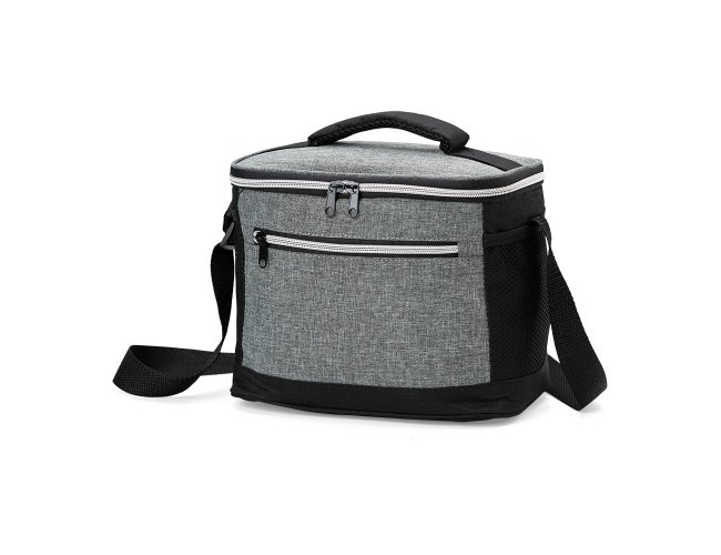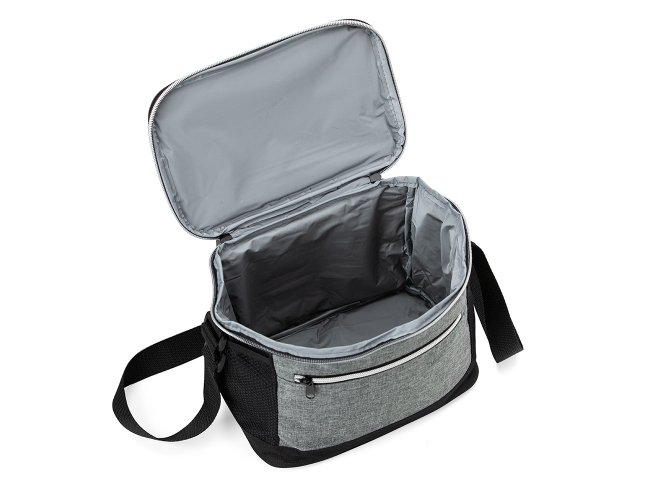 Bolsa térmica de nylon 10 litros com dois compartimentos e bolsos laterais em malha. Compartimento principal com revestimento térmico.