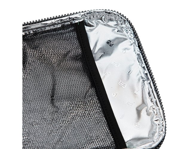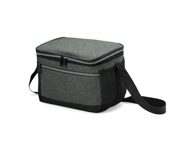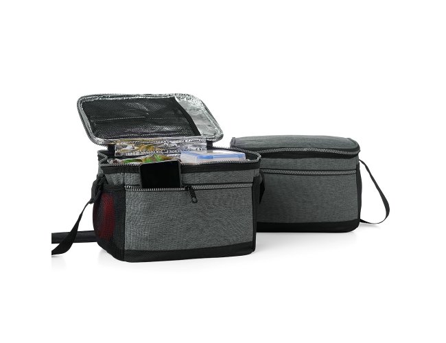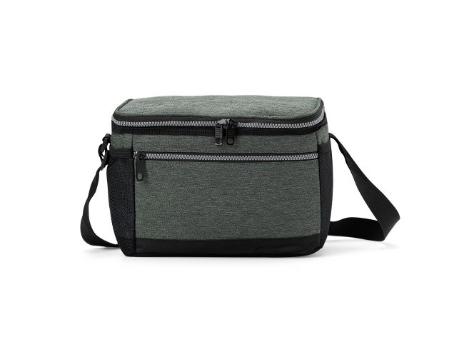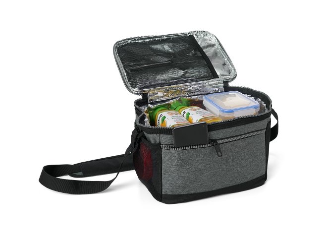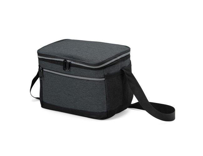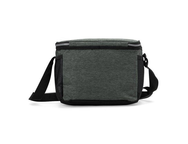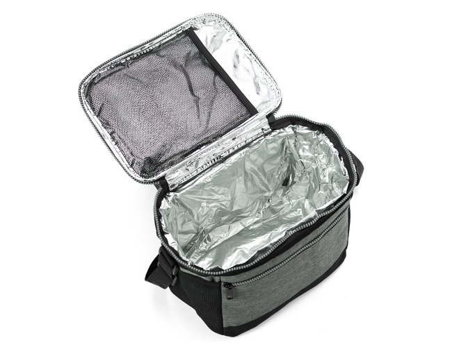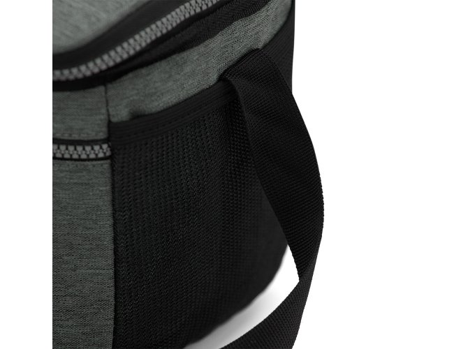 Bolsa térmica de nylon 11 litros com dois compartimentos, sendo o principal com revestimento térmico e bolso telado para utensílios. Possui bolsos laterais em malha e alça transversal com apoio para ombro.