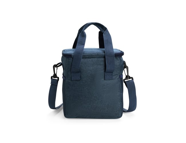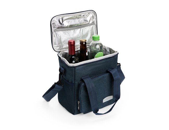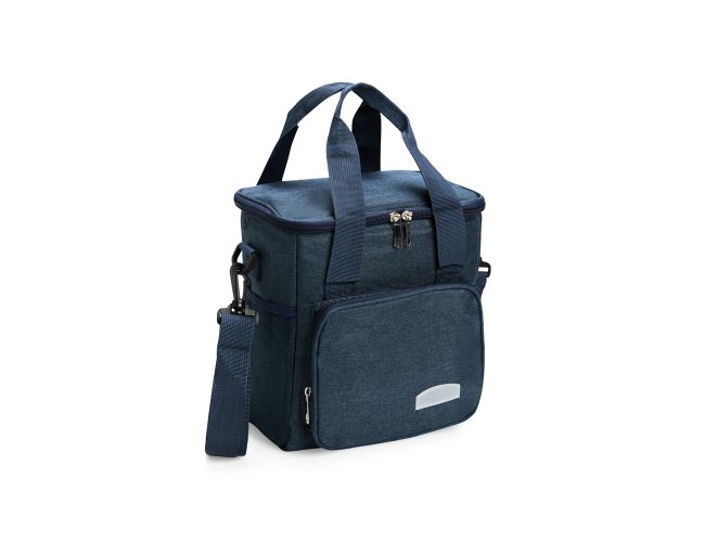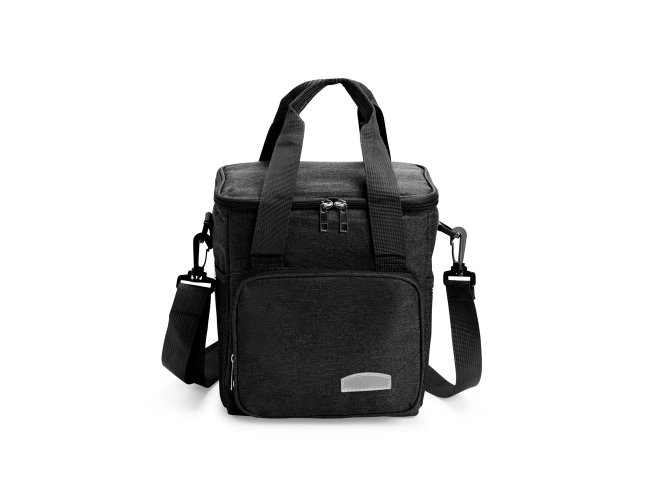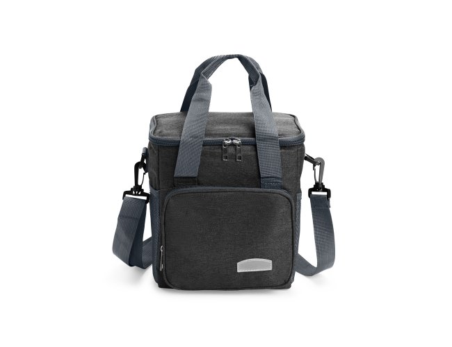 Bolsa térmica em Oxford resistente à água, com capacidade de até 11 litros e fechamento em zíper. Possui revestimento térmico em folha de alumínio na tampa e em PEVA no restante do interior, contribuindo para conservar a temperatura de alimentos e bebidas por mais tempo. Apresenta bolso frontal externo com zíper e dois bolsos laterais em tela de nylon com elástico. Dispõe ainda de duas alças laterais fixas e uma alça transversal removível.