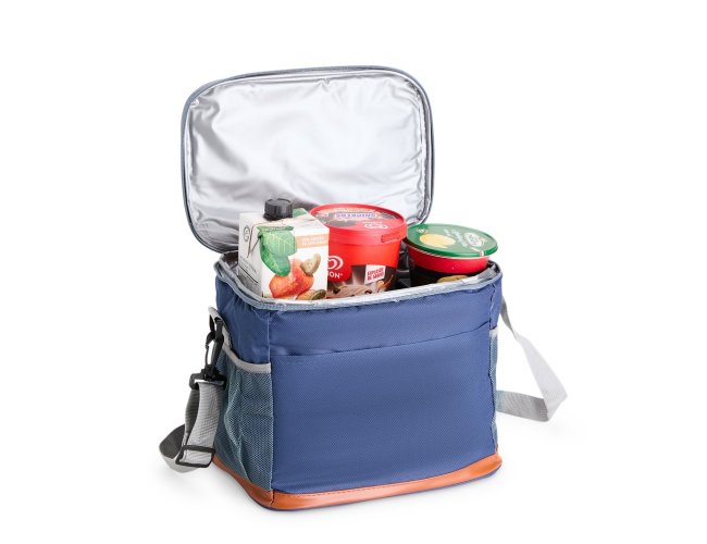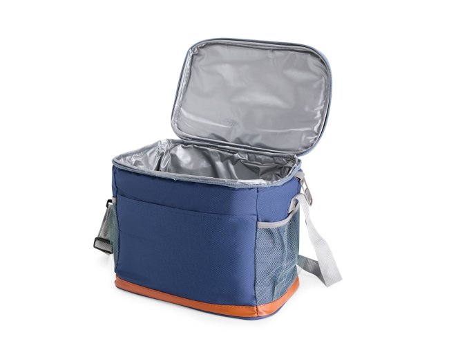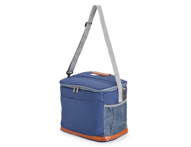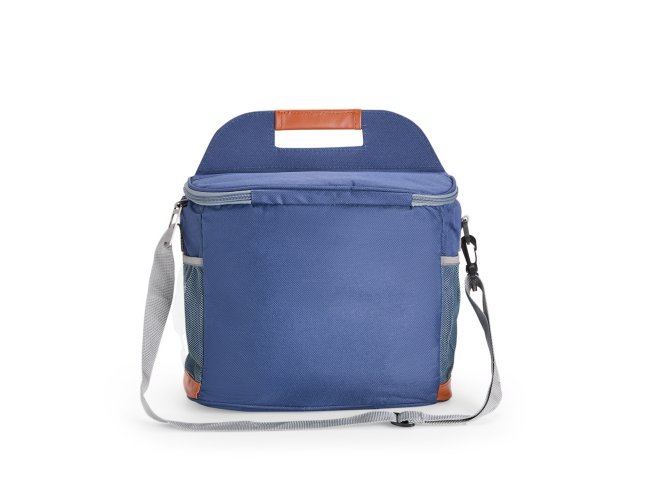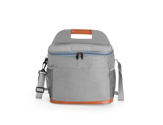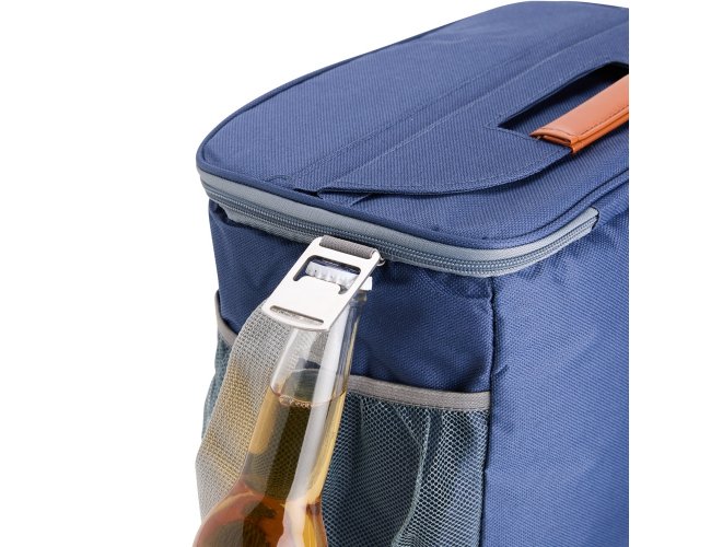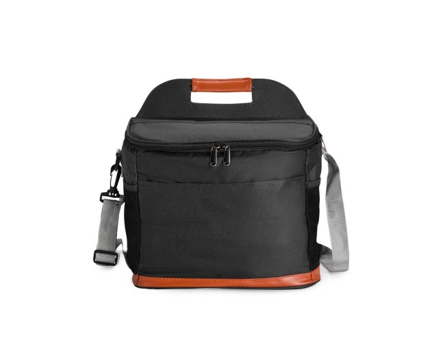 Bolsa térmica confeccionada em Oxford impermeável, com detalhes em couro sintético, fechamento em zíper e capacidade de até 11 litros. Possui revestimento interno em PEVA, que proporciona a conservação de temperatura de alimentos e bebidas por mais tempo. Conta com bolso frontal aberto, dois laterais em tela de nylon com elástico, alça de mão, alça transversal ajustável e abridor de garrafas em inox fixado em uma das laterais.