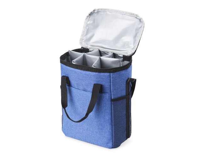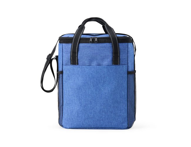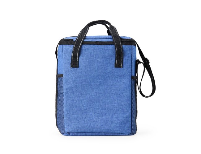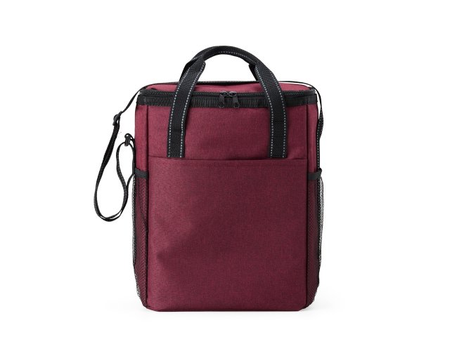 Bolsa térmica de poliéster de 16 litros com bolso frontal e bolsos laterais de nylon. Acompanha placa (removível) com divisórias e fixação de velcro para organização interna.