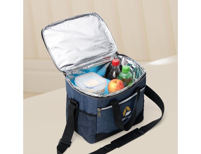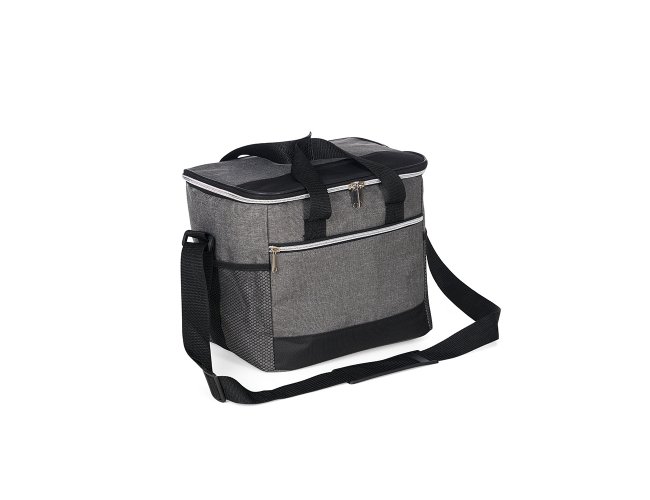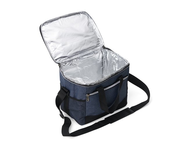 Bolsa térmica confeccionada em poliéster resistente à água e capacidade de até 17 litros. Possui revestimento interno em PEVA, que ajuda a conservar a temperatura de alimentos e bebidas por mais tempo. Conta com bolso frontal com zíper, dois bolsos laterais em tela de nylon, alças de mão e alça transversal fixa, regulável e com apoio para ombro.