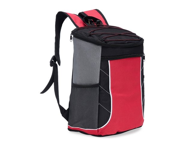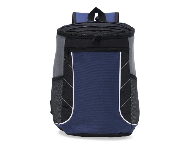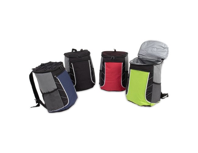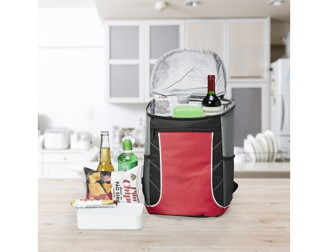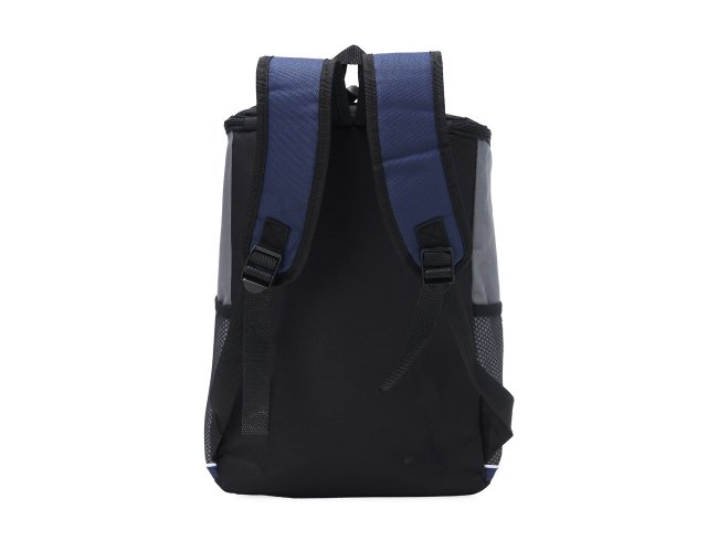 Bolsa térmica de poliéster com dois compartimentos, capacidade de 19 litros. A bolsa possui revestimento térmico em PEVA atóxico com costura soldada antivazamento, bolsos laterais telados, alça de mão e alça para as costas com revestimento espumado.