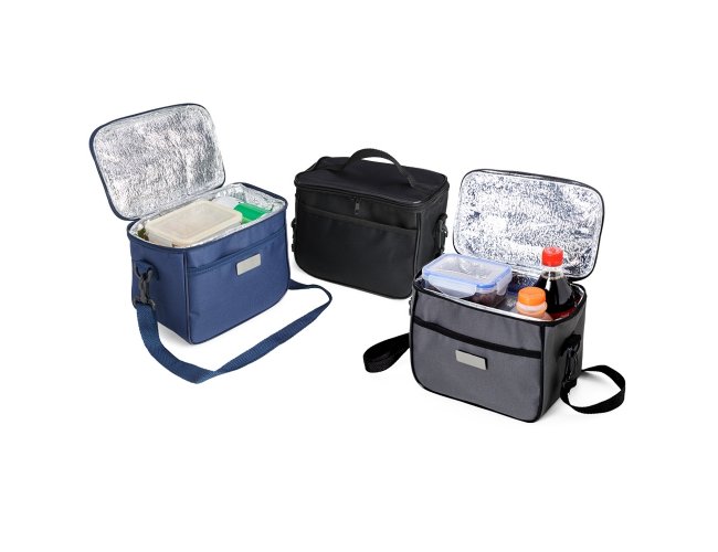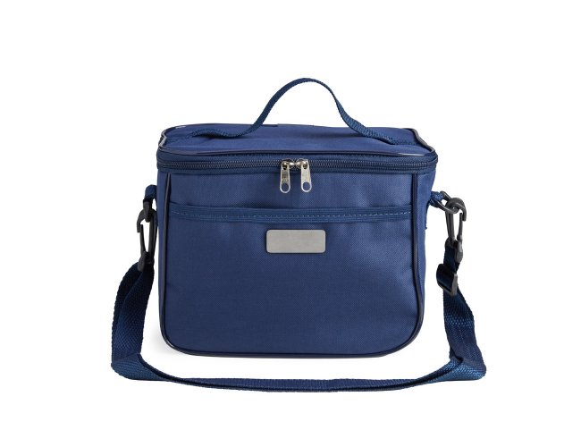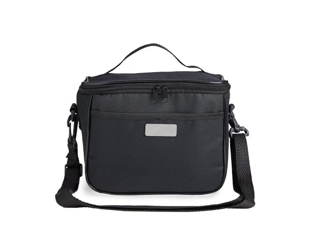Bolsa térmica 6 litros com bolsos externos e alça de mão em nylon, contém bolso frontal aberto e bolso traseiro com zíper. Acompanha plaquinha metálica e alça transversal regulável com mosquetões para encaixe nas fivelas laterais da bolsa.