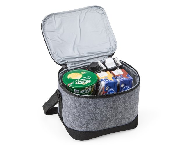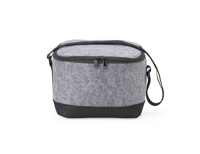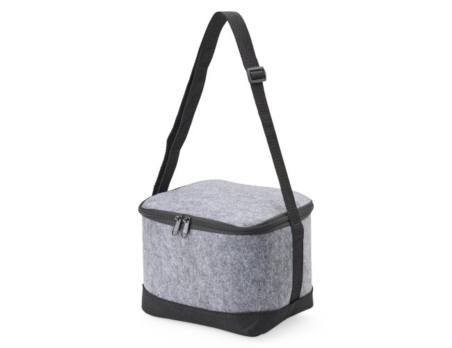 Bolsa térmica em tecido feltro com capacidade para 6 litros, possui revestimento térmico e acompanha alça transversal.