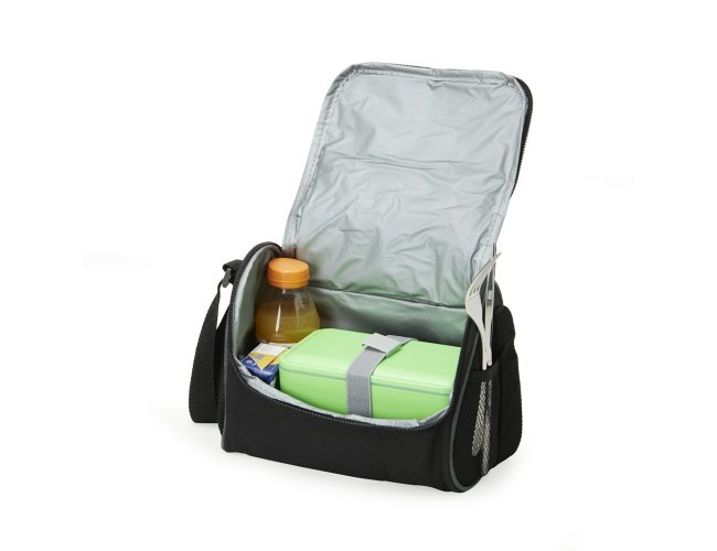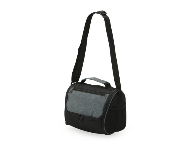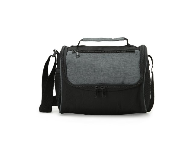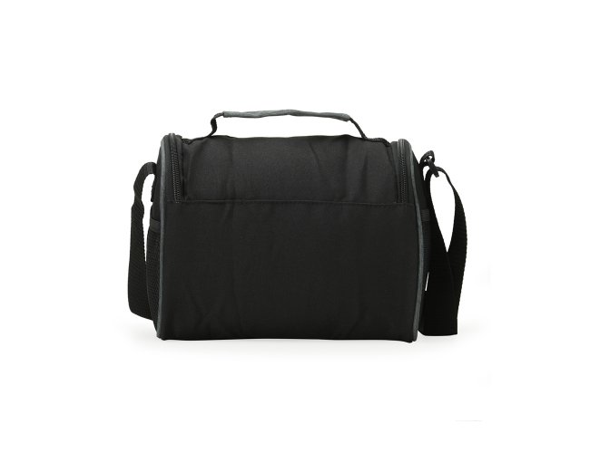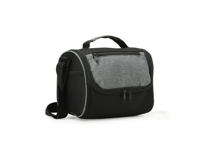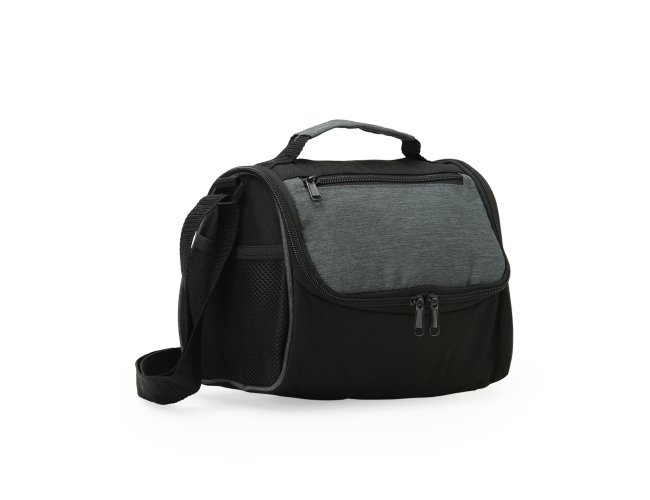 Bolsa térmica de poliéster com dois compartimentos, capacidade de 7 litros. A bolsa possui revestimento térmico em PEVA atóxico, alça de mão, bolsos laterais telados e alça transversal.