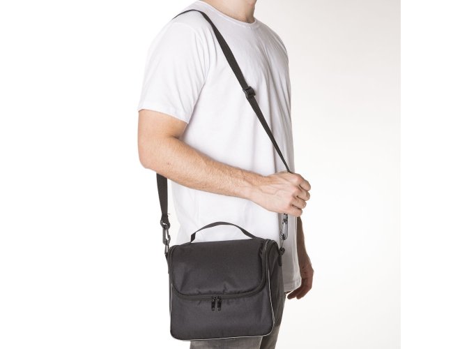 Bolsa térmica 8,5 litros com material externo de nylon. Abertura frontal, possui dois encaixes nas laterais para gancho, alça superior e acompanha plaquinha para personalização.