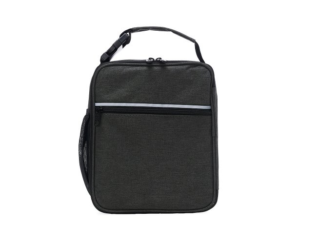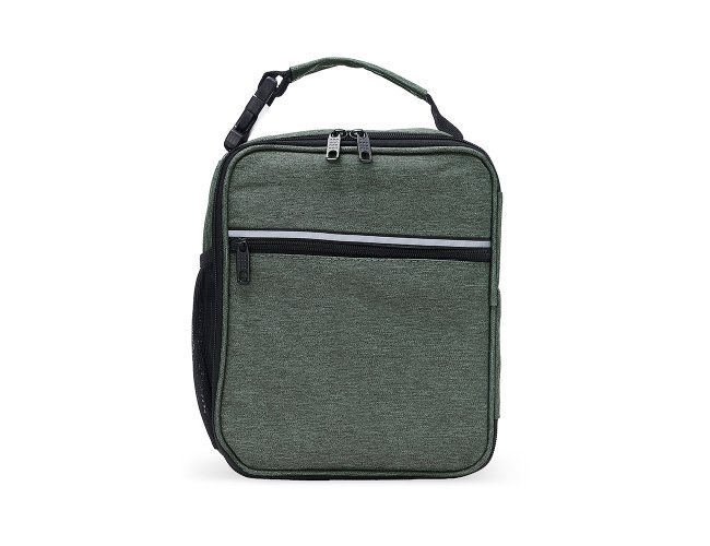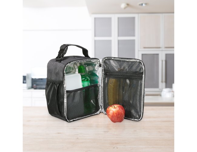 Bolsa térmica de nylon com dois compartimentos, capacidade de 8 litros. Com bolso telado e tela média de proteção interna, a bolsa possui uma faixa frontal refletiva, bolso lateral telado e alça de mão com fivela de encaixe.