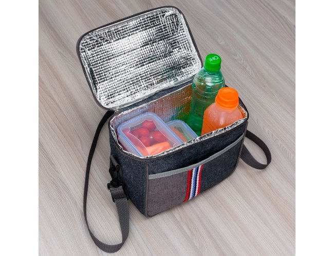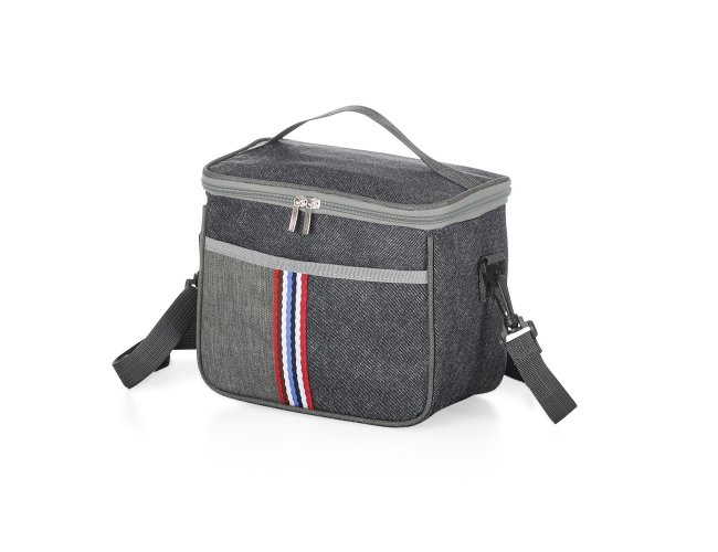 Bolsa térmica de nylon 9 litros com bolso frontal. Acompanha alça transversal.