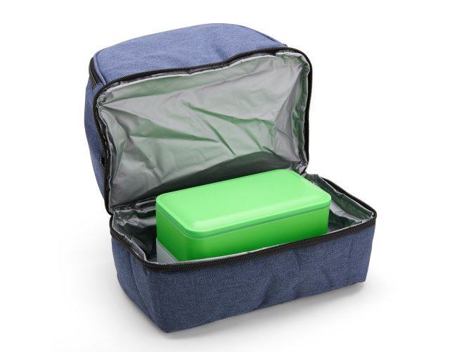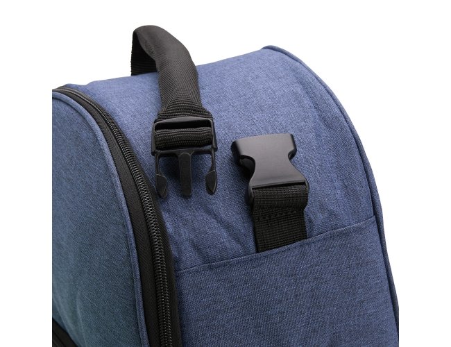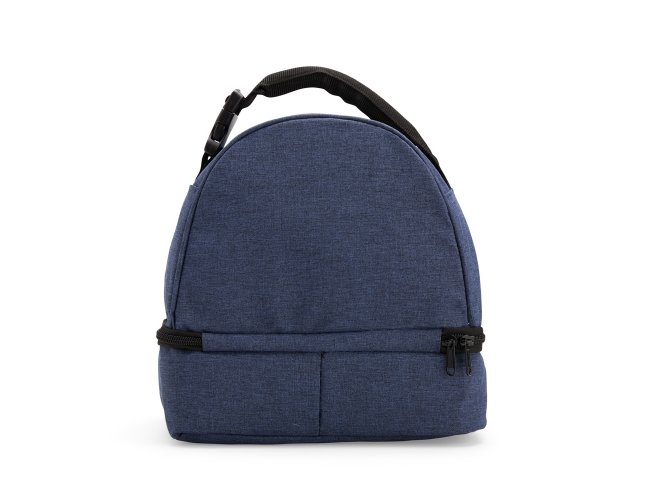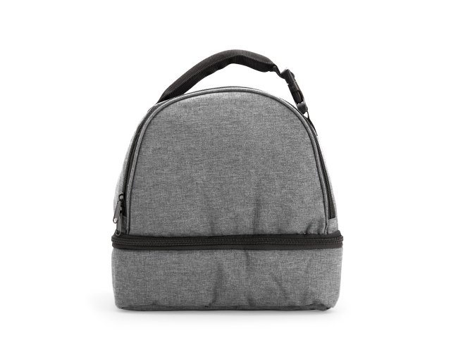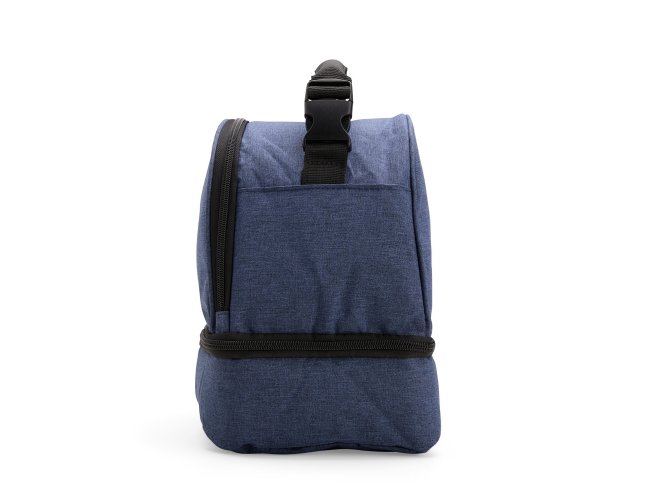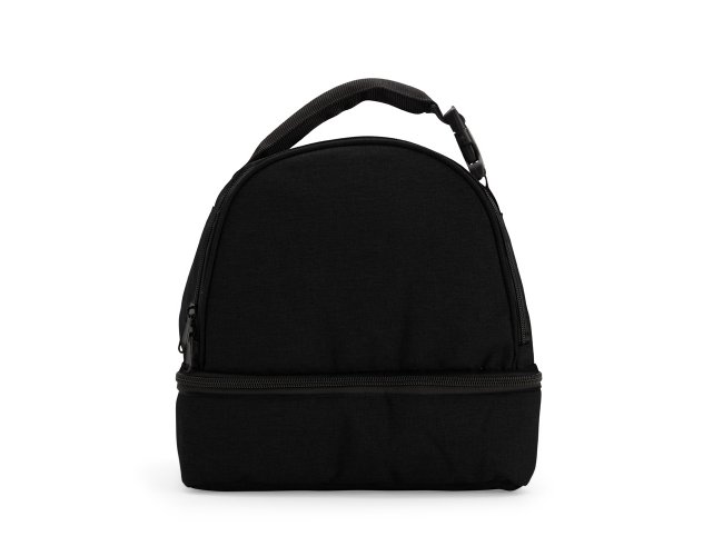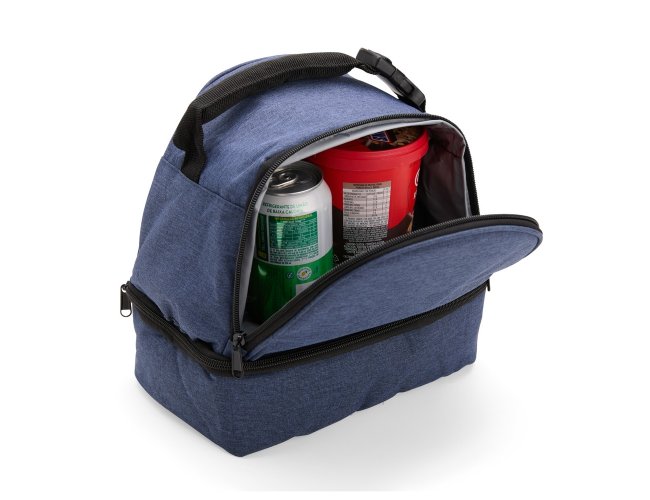 Bolsa térmica dupla feita em poliéster 300D resistente à água, com capacidade total de 12 litros divididos em dois compartimentos revestidos internamente em PEVA: o superior comporta até 5 litros e o inferior, até 3 litros. Possui alça superior com engate em plástico