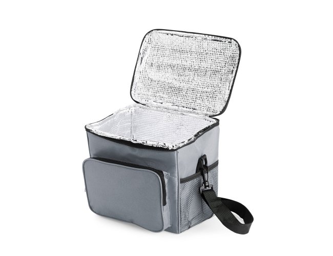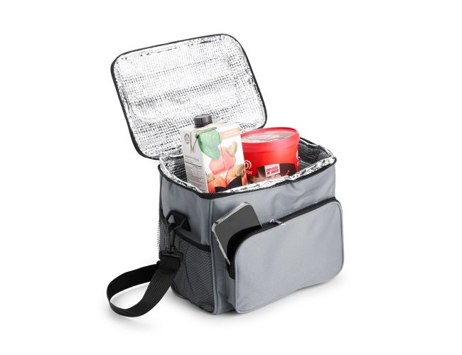 Bolsa térmica em Oxford resistente à água e com capacidade de até 11 litros. Seu revestimento interno em alumínio permite a conservação de temperatura de alimentos e bebidas por mais tempo. Possui também um bolso frontal e mais um par de bolsos laterais em tela de nylon, além de uma alça fixa na tampa e outra transversal.